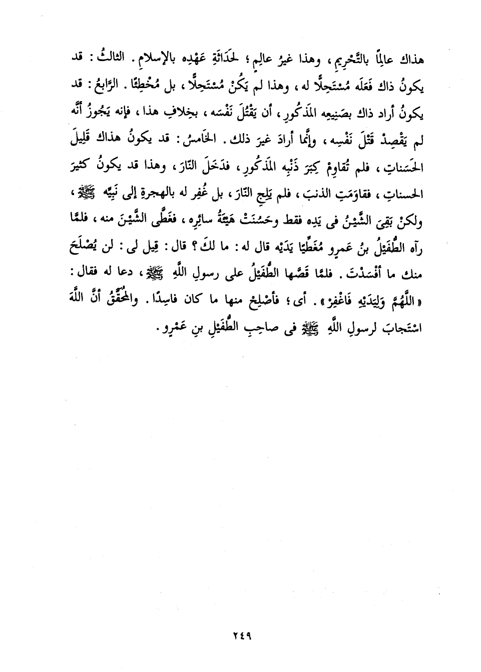 هَذَاكَ عَالِمًا بِالتَّحْرِيمِ، وَهَذَا غَيْرُ عَالِمٍ لِحَدَاثَةِ عَهْدِهِ بِالْإِسْلَامِ. الثَّالِثُ: قَدْ يَكُونُ ذَاكَ فَعَلَهُ مُسْتَحِلًّا لَهُ، وَهَذَا لَمْ يَكُنْ مُسْتَحِلًّا، بَلْ مُخْطِئًا. الرَّابِعُ: قَدْ يَكُونُ أَرَادَ ذَاكَ بِصَنِيعِهِ الْمَذْكُورِ، أَنْ يَقْتُلَ نَفْسَهُ، بِخِلَافِ هَذَا، فَإِنَّهُ يَجُوزُ أَنَّهُ لَمْ يَقْصِدْ قَتْلَ نَفْسِهِ، وَإِنَّمَا أَرَادَ غَيْرَ ذَلِكَ. الْخَامِسُ: قَدْ يَكُونُ هَذَاكَ قَلِيلَ الْحَسَنَاتِ، فَلَمْ تُقَاوِمْ كِبَرَ ذَنْبِهِ الْمَذْكُورِ، فَدَخَلَ النَّارَ، وَهَذَا قَدْ يَكُونُ كَثِيرَ الْحَسَنَاتِ، فَقَاوَمَتِ الذَّنْبَ، فَلَمْ يَلِجِ النَّارَ، بَلْ غُفِرَ لَهُ بِالْهِجْرَةِ إِلَى نَبِيِّهِ - صَلَّى اللَّهُ عَلَيْهِ وَسَلَّمَ - وَلَكِنْ بَقِيَ الشَّيْنُ فِي يَدِهِ فَقَطْ، وَحَسُنَتْ هَيْئَةُ سَائِرِهِ، فَغَطَّى الشَّيْنَ مِنْهُ، فَلَمَّا رَآهُ الطُّفَيْلُ بْنُ عَمْرٍو مُغَطِّيًا يَدَيْهِ، قَالَ لَهُ: مَا لَكَ؟ قَالَ: قِيلَ لِي: لَنْ يُصْلَحَ مِنْكَ مَا أَفْسَدْتَ. فَلَمَّا قَصَّهَا الطُّفَيْلُ عَلَى رَسُولِ اللَّهِ - صَلَّى اللَّهُ عَلَيْهِ وَسَلَّمَ - دَعَا لَهُ فَقَالَ: «اللَّهُمَّ، وَلِيَدَيْهِ فَاغْفِرْ ".» أَيْ فَأَصْلِحْ مِنْهَا مَا كَانَ فَاسِدًا. وَالْمُحَقَّقُ أَنَّ اللَّهَ اسْتَجَابَ لِرَسُولِ اللَّهِ - صَلَّى اللَّهُ عَلَيْهِ وَسَلَّمَ - فِي صَاحِبِ الطُّفَيْلِ بْنِ عَمْرٍو.