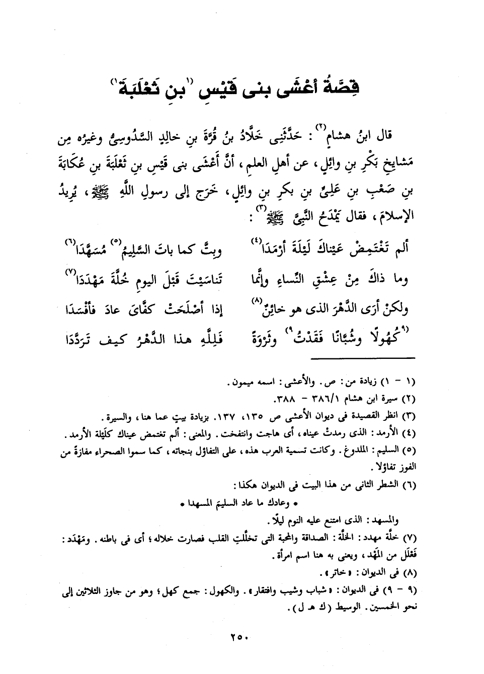 قَالَ ابْنُ هِشَامٍ: حَدَّثَنِي خَلَّادُ بْنُ قُرَّةَ بْنِ خَالِدٍ السَّدُوسِيُّ، وَغَيْرُهُ مِنْ مَشَايِخِ بَكْرِ بْنِ وَائِلٍ، عَنْ أَهْلِ الْعِلْمِ، أَنَّ أَعْشَى بْنَ قَيْسِ بْنِ ثَعْلَبَةَ بْنِ عُكَابَةَ بْنِ صَعْبِ بْنِ عَلِيِّ بْنِ بَكْرِ بْنِ وَائِلٍ، خَرَجَ إِلَى رَسُولِ اللَّهِ - صَلَّى اللَّهُ عَلَيْهِ وَسَلَّمَ - يُرِيدُ الْإِسْلَامَ، فَقَالَ يَمْدَحُ النَّبِيَّ - صَلَّى اللَّهُ عَلَيْهِ وَسَلَّمَ -: