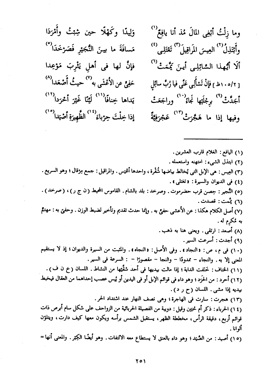 حَفِيٍّ عَنِ الْأَعْشَى بِهِ حَيْثُ أَصْعَدَا ... أَجَدَّتْ بِرِجْلَيْهَا نِجَاءً وَرَاجَعَتْ