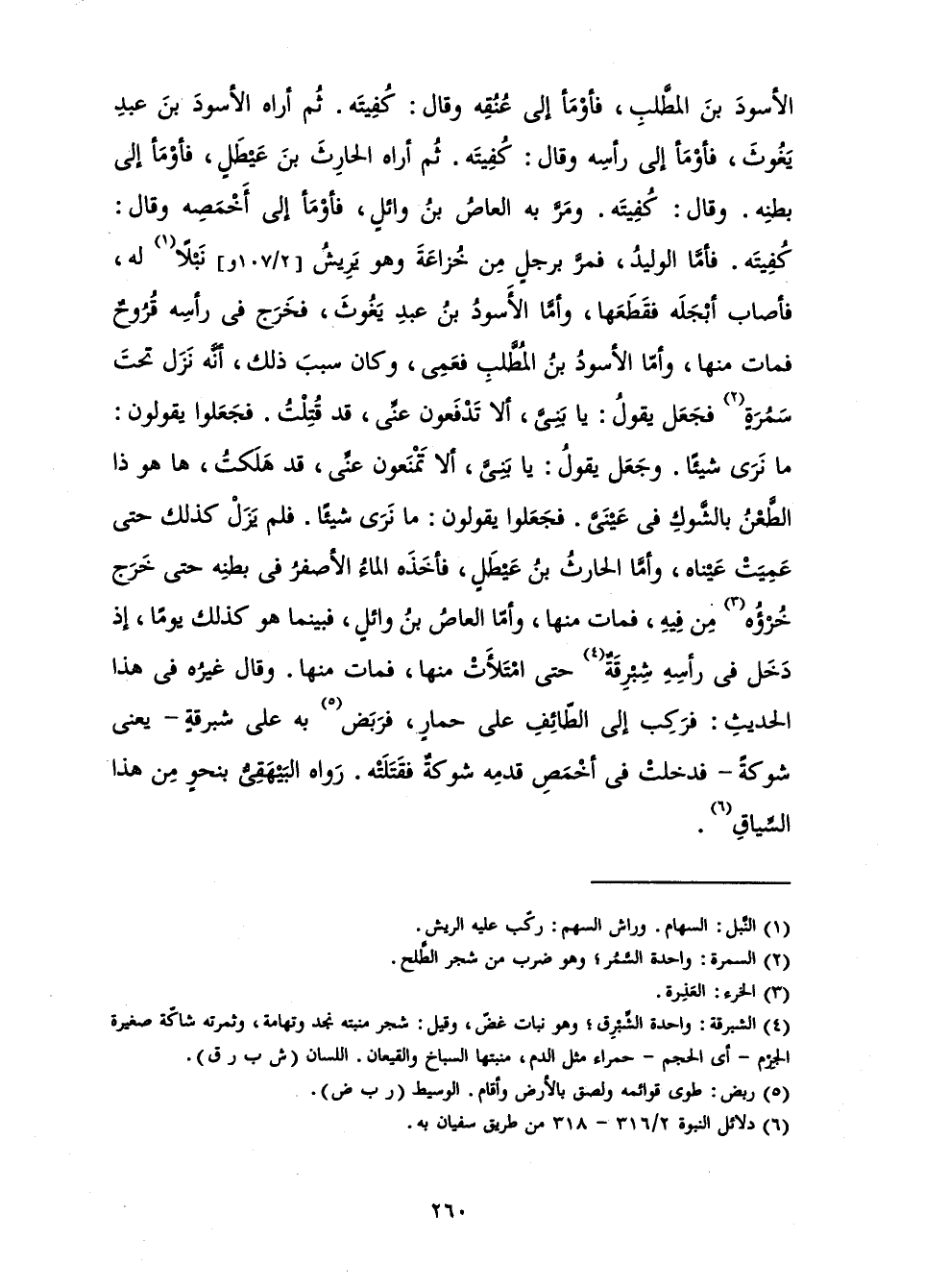 الْأَسْوَدَ بْنَ الْمُطَّلِبِ فَأَوْمَأَ إِلَى عُنُقِهِ، وَقَالَ: كُفِيتَهُ. ثُمَّ أَرَاهُ الْأَسْوَدَ بْنَ عَبْدِ يَغُوثَ فَأَوْمَأَ إِلَى رَأْسِهِ، وَقَالَ: كُفِيتَهُ. ثُمَّ أَرَاهُ الْحَارِثَ بْنَ عَيْطَلٍ فَأَوْمَأَ إِلَى بَطْنِهِ، وَقَالَ: كُفِيتَهُ. وَمَرَّ بِهِ الْعَاصُ بْنُ وَائِلٍ فَأَوْمَأَ إِلَى أَخْمَصِهِ، وَقَالَ: كُفِيتَهُ. فَأَمَّا الْوَلِيدُ فَمَرَّ بِرَجُلٍ مِنْ خُزَاعَةَ وَهُوَ يَرِيشُ نَبْلًا لَهُ، فَأَصَابَ أَبْجَلَهُ فَقَطَعَهَا، وَأَمَّا الْأَسْوَدُ بْنُ عَبْدِ يَغُوثَ فَخَرَجَ فِي رَأْسِهِ قُرُوحٌ، فَمَاتَ مِنْهَا، وَأَمَّا الْأَسْوَدُ بْنُ الْمُطَّلِبِ فَعَمِيَ، وَكَانَ سَبَبَ ذَلِكَ أَنَّهُ نَزَلَ تَحْتَ سَمُرَةٍ، فَجَعَلَ يَقُولُ: يَا بَنِيَّ، أَلَا تَدْفَعُونَ عَنِّي، قَدْ قُتِلْتُ. فَجَعَلُوا يَقُولُونَ: مَا نَرَى شَيْئًا. وَجَعَلَ يَقُولُ: يَا بَنِيَّ، أَلَا تَمْنَعُونَ عَنِّي، قَدْ هَلَكْتُ، هَا هُوَ ذَا الطَّعْنِ بِالشَّوْكِ فِي عَيْنِي. فَجَعَلُوا يَقُولُونَ: مَا نَرَى شَيْئًا. فَلَمْ يَزَلْ كَذَلِكَ حَتَّى عَمِيَتْ عَيْنَاهُ. وَأَمَّا الْحَارِثُ بْنُ عَيْطَلٍ فَأَخَذَهُ الْمَاءُ الْأَصْفَرُ فِي بَطْنِهِ حَتَّى خَرَجَ خُرْؤُهُ مِنْ فِيهِ، فَمَاتَ مِنْهَا، وَأَمَّا الْعَاصُ بْنُ وَائِلٍ فَبَيْنَمَا هُوَ كَذَلِكَ يَوْمًا، إِذْ دَخَلَ فِي رَأْسِهِ شِبْرِقَةٌ حَتَّى امْتَلَأَتْ مِنْهَا، فَمَاتَ مِنْهَا. وَقَالَ غَيْرُهُ فِي هَذَا الْحَدِيثِ: فَرَكِبَ إِلَى الطَّائِفِ عَلَى حِمَارٍ فَرَبَضَ بِهِ عَلَى شِبْرِقَةٍ يَعْنِي شَوْكَةً فَدَخَلَتْ فِي أَخْمَصِ قَدَمِهِ شَوْكَةٌ فَقَتَلَتْهُ. رَوَاهُ الْبَيْهَقِيُّ بِنَحْوٍ مِنْ هَذَا السِّيَاقِ.