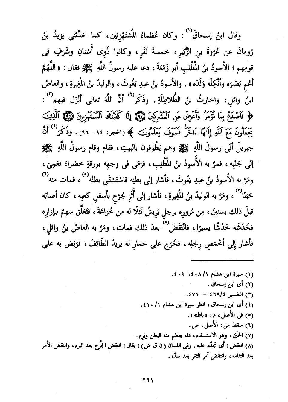 [الْحِجْرِ: 94 - 96] . وَذَكَرَ أَنَّ جِبْرِيلَ أَتَى رَسُولَ اللَّهِ - صَلَّى اللَّهُ عَلَيْهِ وَسَلَّمَ - وَهُمْ يَطُوفُونَ بِالْبَيْتِ، فَقَامَ وَقَامَ رَسُولُ اللَّهِ - صَلَّى اللَّهُ عَلَيْهِ وَسَلَّمَ - إِلَى جَنْبِهِ، فَمَرَّ بِهِ الْأَسْوَدُ بْنُ الْمُطَّلِبِ فَرَمَى فِي وَجْهِهِ بِوَرَقَةٍ خَضْرَاءَ فَعَمِيَ، وَمَرَّ بِهِ الْأَسْوَدُ بْنُ عَبْدِ يَغُوثَ فَأَشَارَ إِلَى بَطْنِهِ فَاسْتَسْقَى بَطْنُهُ، فَمَاتَ مِنْهُ حَبَنًا، وَمَرَّ بِهِ الْوَلِيدُ بْنُ الْمُغِيرَةِ فَأَشَارَ إِلَى أَثَرِ جُرْحٍ بِأَسْفَلِ كَعْبِهِ، كَانَ أَصَابَهُ قَبْلَ ذَلِكَ بِسِنِينَ، مِنْ مُرُورِهِ بِرَجُلٍ يَرِيشُ نَبْلًا لَهُ مِنْ خُزَاعَةَ، فَتَعَلَّقَ سَهْمٌ بِإِزَارِهِ فَخَدَشَهُ خَدْشًا يَسِيرًا، فَانْتَقَضَ بَعْدَ ذَلِكَ، فَمَاتَ، وَمَرَّ بِهِ الْعَاصُ بْنُ وَائِلٍ فَأَشَارَ إِلَى أَخْمَصِ رِجْلِهِ، فَخَرَجَ عَلَى حِمَارٍ لَهُ يُرِيدُ الطَّائِفَ، فَرَبَضَ بِهِ عَلَى