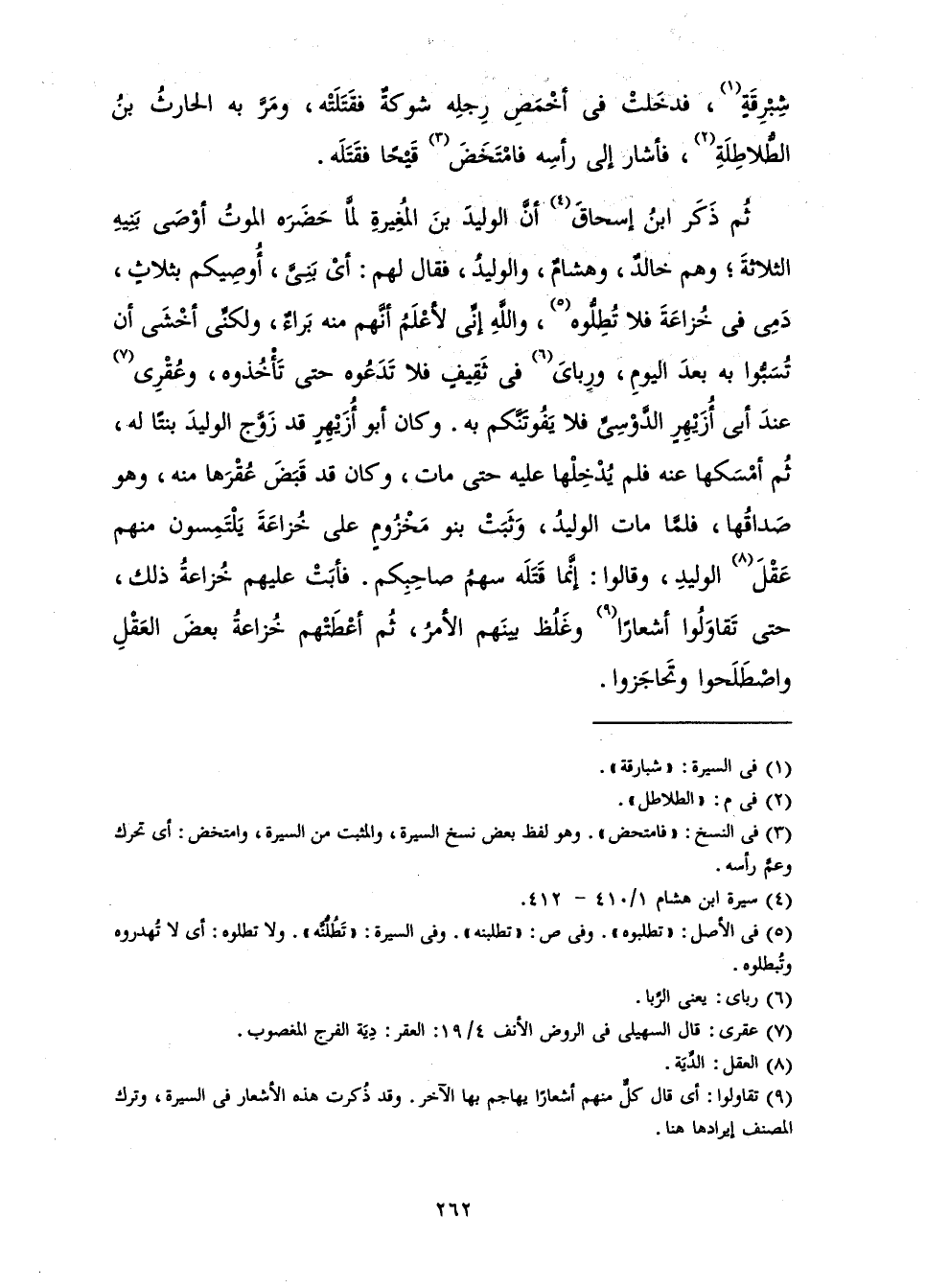 ثُمَّ ذَكَرَ ابْنُ إِسْحَاقَ: أَنَّ الْوَلِيدَ بْنَ الْمُغِيرَةِ لَمَّا حَضَرَهُ الْمَوْتُ أَوْصَى بَنِيهِ الثَّلَاثَةَ ; وَهُمْ خَالِدٌ وَهِشَامٌ وَالْوَلِيدُ فَقَالَ لَهُمْ: أَيْ بَنِيَّ، أُوصِيكُمْ بِثَلَاثٍ ; دَمِي فِي خُزَاعَةَ فَلَا تُطِلُّوهُ، وَاللَّهِ إِنِّي لَأَعْلَمُ أَنَّهُمْ مِنْهُ بَرَاءٌ، وَلَكِنِّي أَخْشَى أَنْ تُسَبُّوا بِهِ بَعْدَ الْيَوْمِ، وَرِبَايَ فِي ثَقِيفٍ، فَلَا تَدَعُوهُ حَتَّى تَأْخُذُوهُ، وَعُقْرِي عِنْدَ أَبِي أُزَيْهِرٍ الدَّوْسِيِّ فَلَا يَفُوتَنَّكُمْ بِهِ، وَكَانَ أَبُو أُزَيْهِرٍ قَدْ زَوَّجَ الْوَلِيدَ بِنْتًا لَهُ، ثُمَّ أَمْسَكَهَا عَنْهُ، فَلَمْ يُدْخِلْهَا عَلَيْهِ حَتَّى مَاتَ، وَكَانَ قَدْ قَبَضَ عُقْرَهَا مِنْهُ، وَهُوَ صَدَاقُهَا، فَلَمَّا مَاتَ الْوَلِيدُ وَثَبَتْ بَنُو مَخْزُومٍ عَلَى خُزَاعَةَ يَلْتَمِسُونَ مِنْهُمْ عَقْلَ الْوَلِيدِ وَقَالُوا: إِنَّمَا قَتَلَهُ سَهْمُ صَاحِبِكُمْ. فَأَبَتْ عَلَيْهِمْ خُزَاعَةُ ذَلِكَ، حَتَّى تَقَاوَلُوا أَشْعَارًا وَغَلُظَ بَيْنَهُمُ الْأَمْرُ، ثُمَّ أَعْطَتْهُمْ خُزَاعَةُ بَعْضَ الْعَقْلِ وَاصْطَلَحُوا وَتَحَاجَزُوا.