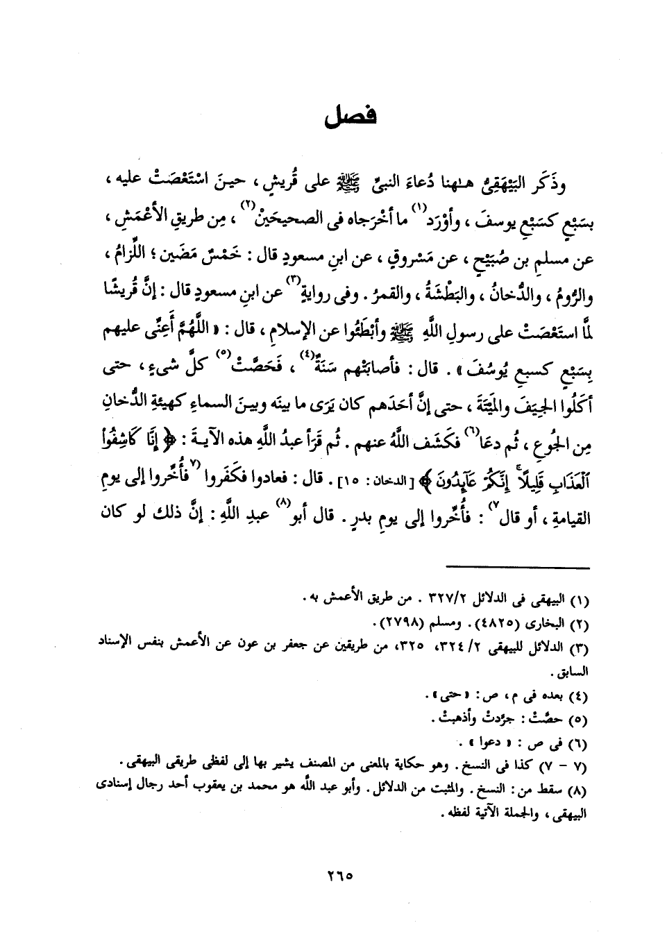 وَذَكَرَ الْبَيْهَقِيُّ هَاهُنَا دُعَاءَ النَّبِيِّ - صَلَّى اللَّهُ عَلَيْهِ وَسَلَّمَ - عَلَى قُرَيْشٍ، حِينَ اسْتَعْصَتْ عَلَيْهِ، بِسَبْعٍ كَسَبْعِ يُوسُفَ، وَأَوْرَدَ مَا أَخْرَجَاهُ فِي " الصَّحِيحَيْنِ " مِنْ طَرِيقِ الْأَعْمَشِ عَنْ مُسْلِمِ بْنِ صُبَيْحٍ عَنْ مَسْرُوقٍ عَنِ ابْنِ مَسْعُودٍ قَالَ: خَمْسٌ مَضَيْنَ ; اللِّزَامُ، وَالرُّومُ، وَالدُّخَانُ، وَالْبَطْشَةُ، وَالْقَمَرُ. وَفِي رِوَايَةٍ عَنِ ابْنِ مَسْعُودٍ قَالَ: «إِنَّ قُرَيْشًا لَمَّا اسْتَعْصَتْ عَلَى رَسُولِ اللَّهِ - صَلَّى اللَّهُ عَلَيْهِ وَسَلَّمَ - وَأَبْطَؤُوا عَنِ الْإِسْلَامِ، قَالَ: " اللَّهُمَّ أَعِنِّي عَلَيْهِمْ بِسَبْعٍ كَسَبْعِ يُوسُفَ ".» قَالَ: فَأَصَابَتْهُمْ سَنَةٌ حَتَّى فَحَصَّتْ كُلَّ شَيْءٍ، حَتَّى أَكَلُوا الْجِيَفَ وَالْمَيْتَةَ، وَحَتَّى إِنَّ أَحَدَهُمْ كَانَ يَرَى مَا بَيْنَهُ وَبَيْنَ السَّمَاءِ كَهَيْئَةِ الدُّخَانِ مِنَ الْجُوعِ، ثُمَّ دَعَا فَكَشَفَ اللَّهُ عَنْهُمْ. ثُمَّ قَرَأَ عَبْدُ اللَّهِ هَذِهِ الْآيَةَ: {إِنَّا كَاشِفُوا الْعَذَابِ قَلِيلًا إِنَّكُمْ عَائِدُونَ} [الدخان: 15] . قَالَ: فَعَادُوا فَكَفَرُوا فَأُخِّرُوا إِلَى يَوْمِ الْقِيَامَةِ، أَوْ قَالَ: فَأُخِّرُوا إِلَى يَوْمِ بَدْرٍ. قَالَ أَبُو عَبْدِ اللَّهِ: إِنَّ ذَلِكَ لَوْ كَانَ