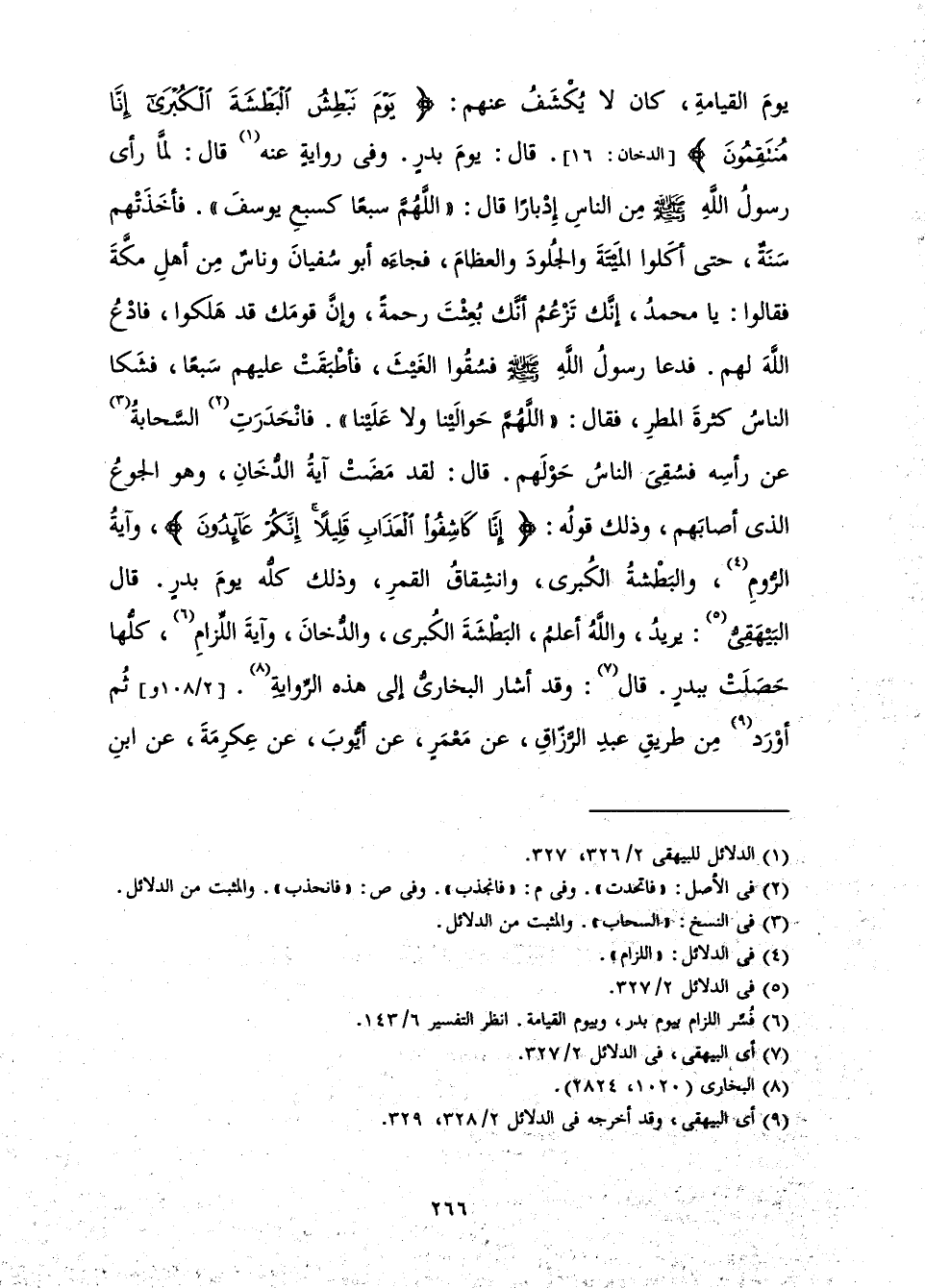 يَوْمَ الْقِيَامَةِ، كَانَ لَا يُكْشَفُ عَنْهُمْ: {يَوْمَ نَبْطِشُ الْبَطْشَةَ الْكُبْرَى إِنَّا مُنْتَقِمُونَ} [الدخان: 16] قَالَ: يَوْمُ بَدْرٍ. وَفِي رِوَايَةٍ عَنْهُ، قَالَ: «لَمَّا رَأَى رَسُولُ اللَّهِ - صَلَّى اللَّهُ عَلَيْهِ وَسَلَّمَ - مِنَ النَّاسِ إِدْبَارًا، قَالَ: " اللَّهُمَّ سَبْعًا كَسَبْعِ يُوسُفَ ". فَأَخَذَتْهُمْ سَنَةٌ، حَتَّى أَكَلُوا الْمَيْتَةَ وَالْجُلُودَ وَالْعِظَامَ، فَجَاءَهُ أَبُو سُفْيَانَ وَنَاسٌ مِنْ أَهْلِ مَكَّةَ، فَقَالُوا: يَا مُحَمَّدُ، إِنَّكَ تَزْعُمُ أَنَّكَ بُعِثْتَ رَحْمَةً، وَإِنَّ قَوْمَكَ قَدْ هَلَكُوا، فَادْعُ اللَّهَ لَهُمْ. فَدَعَا رَسُولُ اللَّهِ - صَلَّى اللَّهُ عَلَيْهِ وَسَلَّمَ - فَسُقُوا الْغَيْثَ، فَأَطْبَقَتْ عَلَيْهِمْ سَبْعًا، فَشَكَا النَّاسُ كَثْرَةَ الْمَطَرِ، فَقَالَ: " اللَّهُمَّ حَوَالَيْنَا وَلَا عَلَيْنَا ". فَانْحَدَرَتِ السَّحَابَةُ عَنْ رَأْسِهِ، فَسُقِيَ النَّاسُ حَوْلَهُمْ.» قَالَ: لَقَدْ مَضَتْ آيَةُ الدُّخَانِ، وَهُوَ الْجُوعُ الَّذِي أَصَابَهُمْ، وَذَلِكَ قَوْلُهُ: {إِنَّا كَاشِفُوا الْعَذَابِ قَلِيلًا إِنَّكُمْ عَائِدُونَ} [الدخان: 15] وَآيَةُ الرُّومِ، وَالْبَطْشَةُ الْكُبْرَى، وَانْشِقَاقُ الْقَمَرِ، وَذَلِكَ كُلُّهُ يَوْمَ بَدْرٍ. قَالَ الْبَيْهَقِيُّ: يُرِيدُ، وَاللَّهُ أَعْلَمُ، الْبَطْشَةَ الْكُبْرَى، وَالدُّخَانَ، وَآيَةَ اللِّزَامِ، كُلُّهَا حَصَلَتْ بِبَدْرٍ. قَالَ: وَقَدْ أَشَارَ الْبُخَارِيُّ إِلَى هَذِهِ الرِّوَايَةِ. ثُمَّ أَوْرَدَ مِنْ طَرِيقِ عَبْدِ الرَّزَّاقِ عَنْ مَعْمَرٍ عَنْ أَيُّوبَ عَنْ عِكْرِمَةَ عَنِ ابْنِ