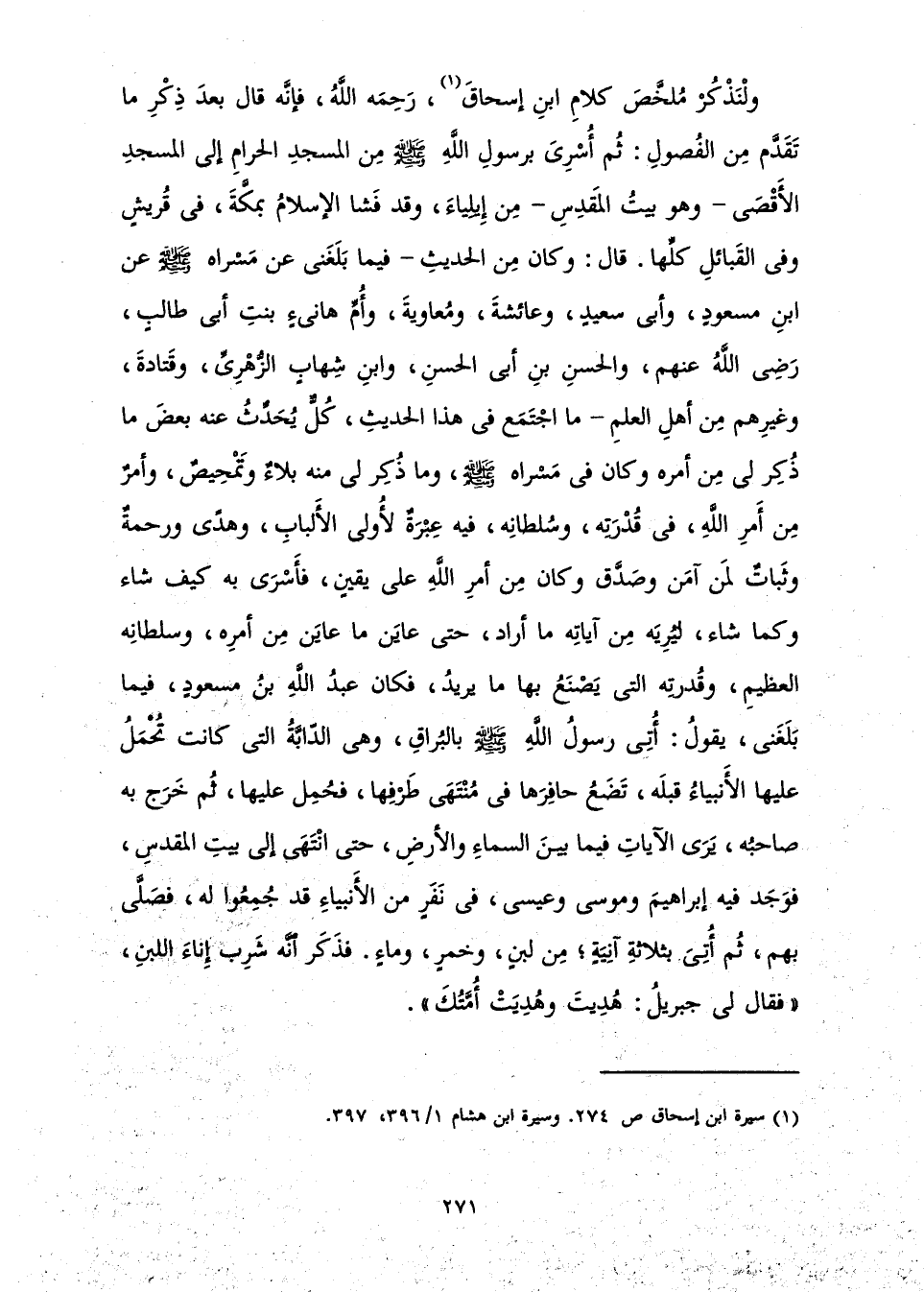 وَلْنَذْكُرْ مُلَخَّصَ كَلَامِ ابْنِ إِسْحَاقَ رَحِمَهُ اللَّهُ، فَإِنَّهُ قَالَ بَعْدَ ذِكْرِ مَا تَقَدَّمَ مِنَ الْفُصُولِ: ثُمَّ أُسْرِيَ بِرَسُولِ اللَّهِ - صَلَّى اللَّهُ عَلَيْهِ وَسَلَّمَ - مِنَ الْمَسْجِدِ الْحَرَامِ إِلَى الْمَسْجِدِ الْأَقْصَى وَهُوَ بَيْتُ الْمَقْدِسِ مِنْ إِيلِيَاءَ، وَقَدْ فَشَا الْإِسْلَامُ بِمَكَّةَ، فِي قُرَيْشٍ وَفِي الْقَبَائِلِ كُلِّهَا، قَالَ: وَكَانَ مِنَ الْحَدِيثِ فِيمَا بَلَغَنِي عَنْ مَسْرَاهُ - صَلَّى اللَّهُ عَلَيْهِ وَسَلَّمَ - عَنِ ابْنِ مَسْعُودٍ وَأَبِي سَعِيدٍ وَعَائِشَةَ، وَمُعَاوِيَةَ وَأُمِّ هَانِئٍ بِنْتِ أَبِي طَالِبٍ رَضِيَ اللَّهُ عَنْهُمْ وَالْحَسَنِ بْنِ أَبِي الْحَسَنِ وَابْنِ شِهَابٍ الزُّهْرِيِّ وَقَتَادَةَ وَغَيْرِهِمْ مِنْ أَهْلِ الْعِلْمِ مَا اجْتَمَعَ فِي هَذَا الْحَدِيثِ، كُلٌّ يُحَدِّثُ عَنْهُ بَعْضَ مَا ذُكِرَ لِي مِنْ أَمْرِهِ وَكَانَ فِي مَسْرَاهُ - صَلَّى اللَّهُ عَلَيْهِ وَسَلَّمَ - وَمَا ذُكِرَ لِي مِنْهُ بَلَاءٌ وَتَمْحِيصٌ، وَأَمْرٌ مِنْ أَمْرِ اللَّهِ، فِي قُدْرَتِهِ وَسُلْطَانِهِ، فِيهِ عِبْرَةٌ لِأُولِي الْأَلْبَابِ، وَهُدًى وَرَحْمَةٌ وَثَبَاتٌ لِمَنْ آمَنَ وَصَدَّقَ، وَكَانَ مِنْ أَمْرِ اللَّهِ عَلَى يَقِينٍ، فَأُسْرِيَ بِهِ كَيْفَ شَاءَ، وَكَمَا شَاءَ، لِيُرِيَهُ مِنْ آيَاتِهِ مَا أَرَادَ، حَتَّى عَايَنَ مَا عَايَنَ مِنْ أَمْرِهِ، وَسُلْطَانِهِ الْعَظِيمِ، وَقُدْرَتِهِ الَّتِي يَصْنَعُ بِهَا مَا يُرِيدُ، فَكَانَ عَبْدُ اللَّهِ بْنُ مَسْعُودٍ فِيمَا بَلَغَنِي، يَقُولُ: «أُتِيَ رَسُولُ اللَّهِ - صَلَّى اللَّهُ عَلَيْهِ وَسَلَّمَ - بِالْبُرَاقِ، وَهِيَ الدَّابَّةُ الَّتِي كَانَتْ تُحْمَلُ عَلَيْهَا الْأَنْبِيَاءُ قَبْلَهُ، تَضَعُ حَافِرَهَا فِي مُنْتَهَى طَرْفِهَا، فَحُمِلَ عَلَيْهَا، ثُمَّ خَرَجَ بِهِ صَاحِبُهُ، يَرَى الْآيَاتِ فِيمَا بَيْنَ السَّمَاءِ وَالْأَرْضِ، حَتَّى انْتَهَى إِلَى بَيْتِ الْمَقْدِسِ، فَوَجَدَ فِيهِ إِبْرَاهِيمَ وَمُوسَى وَعِيسَى، فِي نَفَرٍ مِنَ الْأَنْبِيَاءِ، قَدْ جُمِعُوا لَهُ، فَصَلَّى بِهِمْ، ثُمَّ أُتِيَ بِثَلَاثَةِ آنِيَةٍ ; مِنْ لَبَنٍ، وَخَمْرٍ، وَمَاءٍ. فَذَكَرَ أَنَّهُ شَرِبَ إِنَاءَ اللَّبَنِ، " فَقَالَ لِي جِبْرِيلُ: هُدِيتَ وَهُدِيَتْ أُمَّتُكَ ".»