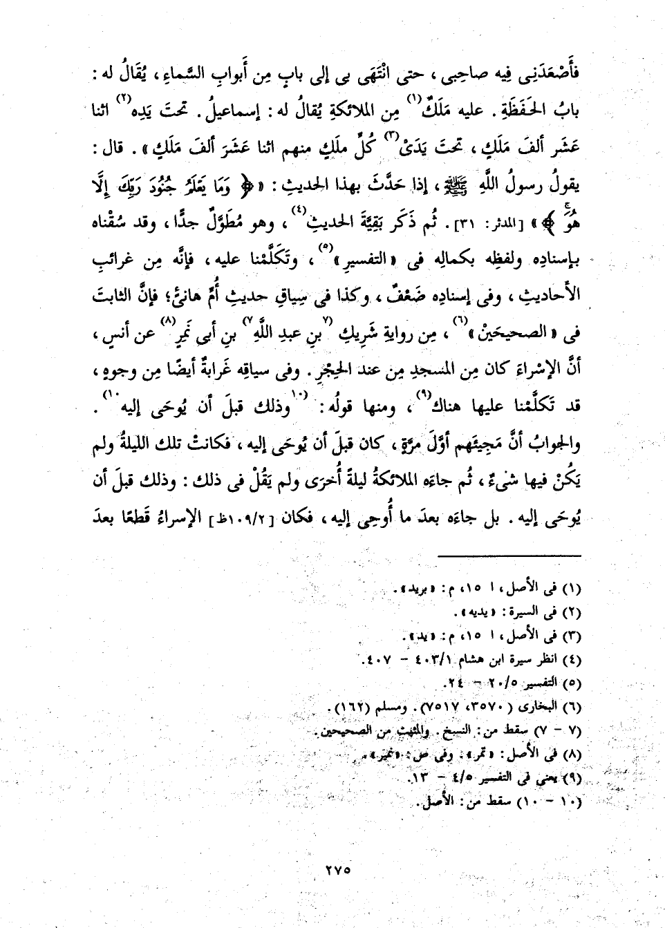 فَأَصْعَدَنِي فِيهِ صَاحِبِي، حَتَّى انْتَهَى بِي إِلَى بَابٍ مِنْ أَبْوَابِ السَّمَاءِ، يُقَالُ لَهُ: بَابُ الْحَفَظَةِ. عَلَيْهِ مَلَكٌ مِنَ الْمَلَائِكَةِ يُقَالُ لَهُ: إِسْمَاعِيلُ. تَحْتَ يَدِهِ اثْنَا عَشَرَ أَلْفَ مَلَكٍ، تَحْتَ يَدَيْ كُلِّ مَلَكٍ مِنْهُمُ اثْنَا عَشَرَ أَلْفَ مَلَكَ ". قَالَ: يَقُولُ رَسُولُ اللَّهِ - صَلَّى اللَّهُ عَلَيْهِ وَسَلَّمَ - إِذَا حَدَّثَ بِهَذَا الْحَدِيثِ: {وَمَا يَعْلَمُ جُنُودُ رَبِّكَ إِلَّا هُوَ} [المدثر: 31] » [الْمُدَّثِّرِ: 31] ثُمَّ ذَكَرَ بَقِيَّةَ الْحَدِيثِ، وَهُوَ مُطَوَّلٌ جِدًّا، وَقَدْ سُقْنَاهُ بِإِسْنَادِهِ وَلَفْظِهِ بِكَمَالِهِ فِي " التَّفْسِيرِ " وَتَكَلَّمْنَا عَلَيْهِ ; فَإِنَّهُ مِنْ غَرَائِبِ الْأَحَادِيثِ، وَفِي إِسْنَادِهِ ضَعْفٌ، وَكَذَا فِي سِيَاقِ حَدِيثِ أُمِّ هَانِئٍ ; فَإِنَّ الثَّابِتَ فِي " الصَّحِيحَيْنِ "، مِنْ رِوَايَةِ شَرِيكِ بْنِ عَبْدِ اللَّهِ بْنِ أَبِي نَمِرٍ عَنْ أَنَسٍ أَنَّ الْإِسْرَاءَ كَانَ مِنَ الْمَسْجِدِ مِنْ عِنْدِ الْحِجْرِ. وَفِي سِيَاقِهِ غَرَابَةٌ أَيْضًا مِنْ وُجُوهٍ، قَدْ تَكَلَّمْنَا عَلَيْهَا هُنَاكَ، وَمِنْهَا قَوْلُهُ: وَذَلِكَ قَبْلَ أَنْ يُوحَى إِلَيْهِ. وَالْجَوَابُ أَنَّ مَجِيئَهُمْ أَوَّلَ مَرَّةٍ كَانَ قَبْلَ أَنْ يُوحَى إِلَيْهِ، فَكَانَتْ تِلْكَ اللَّيْلَةُ وَلَمْ يَكُنْ فِيهَا شَيْءٌ، ثُمَّ جَاءَهُ الْمَلَائِكَةُ لَيْلَةً أُخْرَى وَلَمْ يَقُلْ فِي ذَلِكَ: وَذَلِكَ قَبْلَ أَنْ يُوحَى إِلَيْهِ. بَلْ جَاءَهُ بَعْدَ مَا أُوحِيَ إِلَيْهِ، فَكَانَ الْإِسْرَاءُ قَطْعًا بَعْدَ