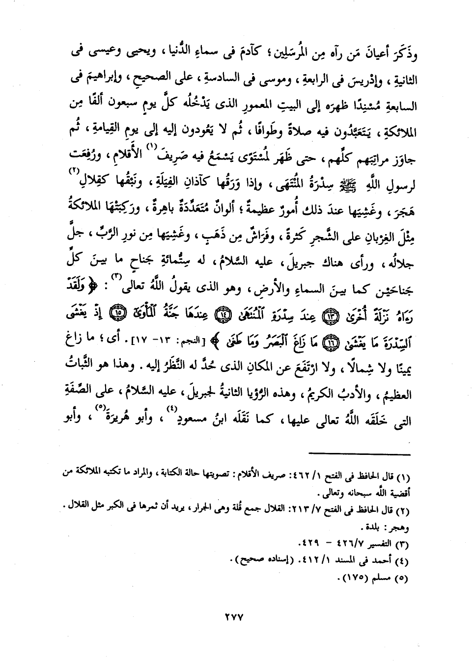وَذَكَرَ أَعْيَانَ مَنْ رَآهُ مِنَ الْمُرْسَلِينَ ; كَآدَمَ فِي سَمَاءِ الدُّنْيَا، وَيَحْيَى وَعِيسَى فِي الثَّانِيَةِ، وَإِدْرِيسَ فِي الرَّابِعَةِ، وَمُوسَى فِي السَّادِسَةِ، عَلَى الصَّحِيحِ، وَإِبْرَاهِيمَ فِي السَّابِعَةِ مُسْنِدًا ظَهْرَهُ إِلَى الْبَيْتِ الْمَعْمُورِ الَّذِي يَدْخُلُهُ كُلَّ يَوْمٍ سَبْعُونَ أَلْفًا مِنَ الْمَلَائِكَةِ، يَتَعَبَّدُونَ فِيهِ صَلَاةً وَطَوَافًا، ثُمَّ لَا يَعُودُونَ إِلَيْهِ إِلَى يَوْمِ الْقِيَامَةِ، ثُمَّ جَاوَزَ مَرَاتِبَهُمْ كُلَّهُمْ، حَتَّى ظَهَرَ لِمُسْتَوًى يَسْمَعُ فِيهِ صَرِيفَ الْأَقْلَامِ، وَرُفِعَتْ لِرَسُولِ اللَّهِ - صَلَّى اللَّهُ عَلَيْهِ وَسَلَّمَ - سِدْرَةُ الْمُنْتَهَى، وَإِذَا وَرَقُهَا كَآذَانِ الْفِيَلَةِ، وَنَبْقُهَا كَقِلَالِ هَجَرَ، وَغَشِيَهَا عِنْدَ ذَلِكَ أُمُورٌ عَظِيمَةٌ ; أَلْوَانٌ مُتَعَدِّدَةٌ بَاهِرَةٌ، وَرَكِبَتْهَا الْمَلَائِكَةُ مِثْلَ الْغِرْبَانِ عَلَى الشَّجَرِ كَثْرَةً، وَفَرَاشٌ مِنْ ذَهَبٍ، وَغَشِيَهَا مِنْ نُورِ الرَّبِّ جَلَّ جَلَالُهُ، وَرَأَى هُنَاكَ جِبْرِيلَ، عَلَيْهِ السَّلَامُ، لَهُ سِتُّمِائَةِ جَنَاحٍ مَا بَيْنَ كُلِّ جَنَاحَيْنِ كَمَا بَيْنَ السَّمَاءِ وَالْأَرْضِ، وَهُوَ الَّذِي يَقُولُ اللَّهُ تَعَالَى: {وَلَقَدْ رَآهُ نَزْلَةً أُخْرَى عِنْدَ سِدْرَةِ الْمُنْتَهَى عِنْدَهَا جَنَّةُ الْمَأْوَى إِذْ يَغْشَى السِّدْرَةَ مَا يَغْشَى مَا زَاغَ الْبَصَرُ وَمَا طَغَى} [النجم: 13]