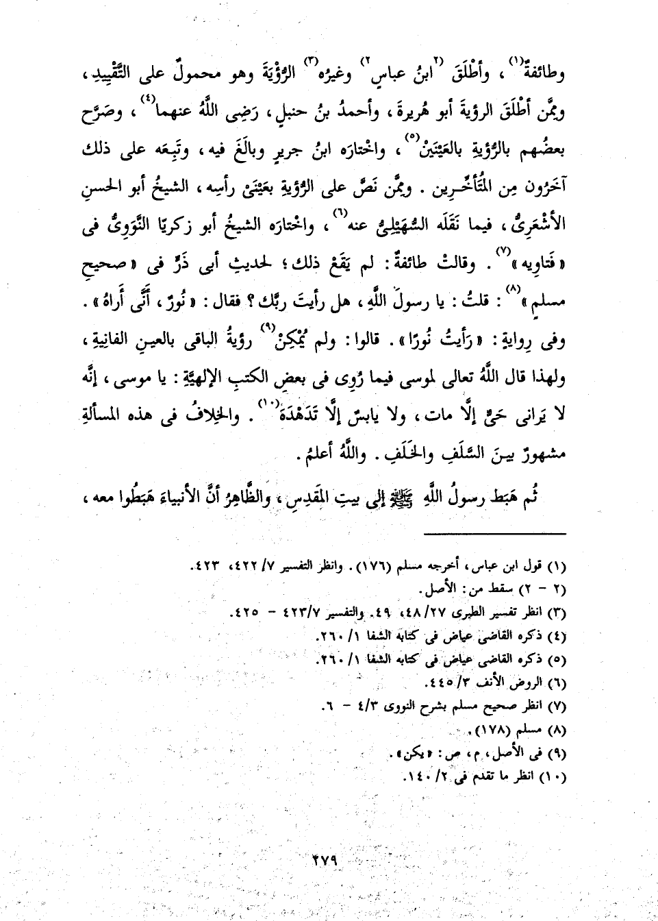 وَطَائِفَةٌ، وَأَطْلَقَ ابْنُ عَبَّاسٍ وَغَيْرُهُ الرُّؤْيَةَ، وَهُوَ مَحْمُولٌ عَلَى التَّقْيِيدِ. وَمِمَّنْ أَطْلَقَ الرُّؤْيَةَ أَبُو هُرَيْرَةَ وَأَحْمَدُ بْنُ حَنْبَلٍ رَضِيَ اللَّهُ عَنْهُمَا، وَصَرَّحَ بَعْضُهُمْ بِالرُّؤْيَةِ بِالْعَيْنَيْنِ، وَاخْتَارَهُ ابْنُ جَرِيرٍ وَبَالَغَ فِيهِ، وَتَبِعَهُ عَلَى ذَلِكَ آخَرُونَ مِنَ الْمُتَأَخِّرِينَ. وَمِمَّنْ نَصَّ عَلَى الرُّؤْيَةِ بِعَيْنَيْ رَأْسِهِ: الشَّيْخُ أَبُو الْحَسَنِ الْأَشْعَرِيُّ فِيمَا نَقَلَهُ السُّهَيْلِيُّ عَنْهُ، وَاخْتَارَهُ الشَّيْخُ أَبُو زَكَرِيَّا النَّوَوِيُّ فِي " فَتَاوِيهِ ". وَقَالَتْ طَائِفَةٌ: لَمْ يَقَعْ ذَلِكَ ; لِحَدِيثِ أَبِي ذَرٍّ فِي " صَحِيحِ مُسْلِمٍ "، «قُلْتُ: يَا رَسُولَ اللَّهِ، هَلْ رَأَيْتَ رَبَّكَ؟ فَقَالَ: " نُورٌ أَنَّى أَرَاهُ» " وَفِي رِوَايَةٍ: " «رَأَيْتُ نُورًا» ". قَالُوا: وَلَمْ يُمْكِنْ رُؤْيَةُ الْبَاقِي بِالْعَيْنِ الْفَانِيَةِ، وَلِهَذَا قَالَ اللَّهُ تَعَالَى لِمُوسَى فِيمَا رُوِيَ فِي بَعْضِ الْكُتُبِ الْإِلَهِيَّةِ: يَا مُوسَى، إِنَّهُ لَا يَرَانِي حَيٌّ إِلَّا مَاتَ، وَلَا يَابِسٌ إِلَّا تَدَهْدَهَ. وَالْخِلَافُ فِي هَذِهِ الْمَسْأَلَةِ مَشْهُورٌ بَيْنَ السَّلَفِ وَالْخَلَفِ. وَاللَّهُ أَعْلَمُ.