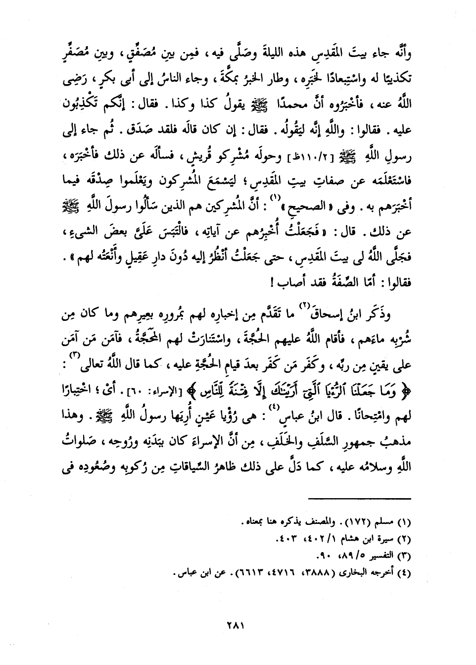 وَذَكَرَ ابْنُ إِسْحَاقَ مَا تَقَدَّمَ مِنْ إِخْبَارِهِ لَهُمْ بِمُرُورِهِ بِعِيرِهِمْ، وَمَا كَانَ مِنْ شُرْبِهِ مَاءَهُمْ. فَأَقَامَ اللَّهُ عَلَيْهِمُ الْحُجَّةَ، وَاسْتَنَارَتْ لَهُمُ الْمَحَجَّةُ، فَآمَنَ مَنْ آمَنَ عَلَى يَقِينٍ مِنْ رَبِّهِ، وَكَفَرَ مَنْ كَفَرَ بَعْدَ قِيَامِ الْحُجَّةِ عَلَيْهِ، كَمَا قَالَ اللَّهُ تَعَالَى: {وَمَا جَعَلْنَا الرُّؤْيَا الَّتِي أَرَيْنَاكَ إِلَّا فِتْنَةً لِلنَّاسِ} [الإسراء: 60] أَيِ ; اخْتِبَارًا لَهُمْ وَامْتِحَانًا. قَالَ ابْنُ عَبَّاسٍ: هِيَ رُؤْيَا عَيْنٍ أُرِيَهَا رَسُولُ اللَّهِ - صَلَّى اللَّهُ عَلَيْهِ وَسَلَّمَ -. وَهَذَا مَذْهَبُ جُمْهُورِ السَّلَفِ وَالْخَلَفِ، مِنْ أَنَّ الْإِسْرَاءَ كَانَ بِبَدَنِهِ وَرُوحِهِ صَلَوَاتُ اللَّهِ وَسَلَامُهُ عَلَيْهِ، كَمَا دَلَّ عَلَى ذَلِكَ ظَاهِرُ السِّيَاقَاتِ مِنْ رُكُوبِهِ وَصُعُودِهِ فِي