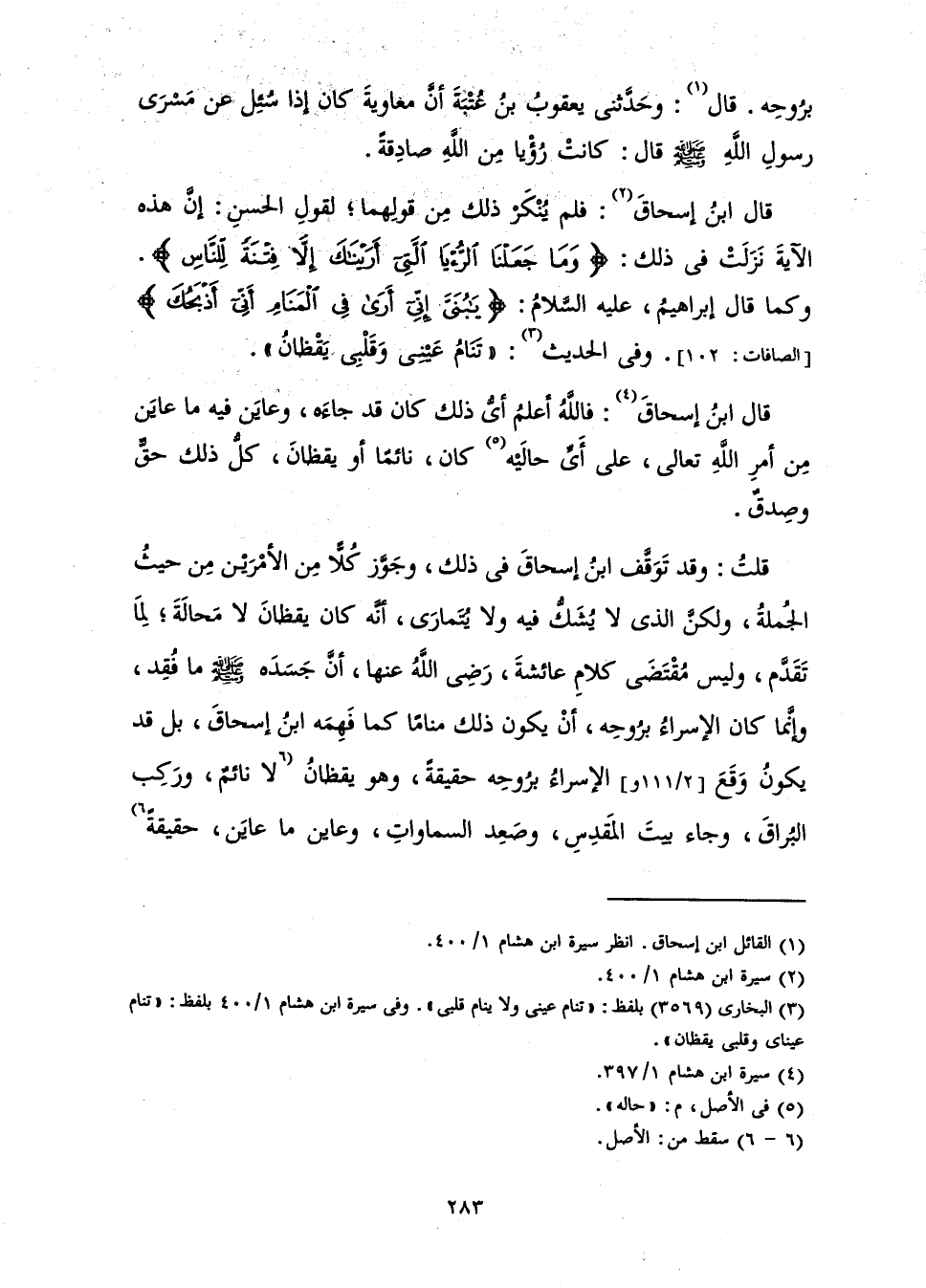 قَالَ ابْنُ إِسْحَاقَ فَلَمْ يُنْكَرْ ذَلِكَ مِنْ قَوْلِهِمَا ; لِقَوْلِ الْحَسَنِ: إِنَّ هَذِهِ الْآيَةَ نَزَلَتْ فِي ذَلِكَ {وَمَا جَعَلْنَا الرُّؤْيَا الَّتِي أَرَيْنَاكَ إِلَّا فِتْنَةً لِلنَّاسِ} [الإسراء: 60] ، وَكَمَا قَالَ إِبْرَاهِيمُ عَلَيْهِ السَّلَامُ: {يَا بُنَيَّ إِنِّي أَرَى فِي الْمَنَامِ أَنِّي أَذْبَحُكَ} [الصافات: 102] وَفِي الْحَدِيثِ: «تَنَامُ عَيْنِي وَقَلْبِي يَقْظَانُ»