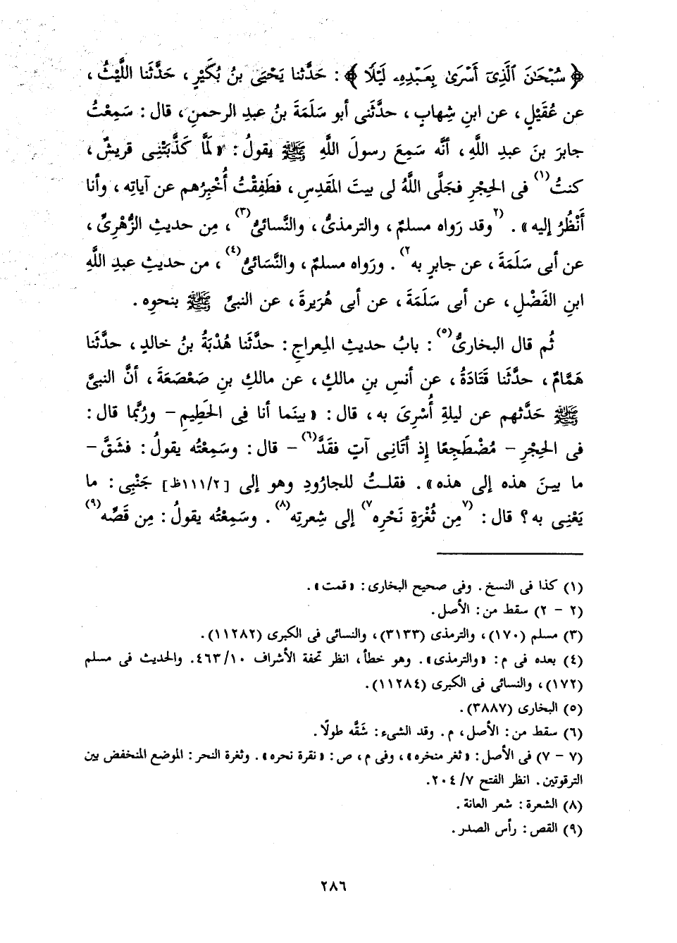 {سُبْحَانَ الَّذِي أَسْرَى بِعَبْدِهِ لَيْلًا} [الإسراء: 1] حَدَّثَنَا يَحْيَى بْنُ بُكَيْرٍ حَدَّثَنَا اللَّيْثُ عَنْ عُقَيْلٍ عَنِ ابْنِ شِهَابٍ حَدَّثَنِي أَبُو سَلَمَةَ بْنُ عَبْدِ الرَّحْمَنِ قَالَ: سَمِعْتُ جَابِرَ بْنَ عَبْدِ اللَّهِ أَنَّهُ سَمِعَ رَسُولَ اللَّهِ - صَلَّى اللَّهُ عَلَيْهِ وَسَلَّمَ - يَقُولُ: «لَمَّا كَذَّبَتْنِي قُرَيْشٌ، كُنْتُ فِي الْحِجْرِ، فَجَلَّى اللَّهُ لِي بَيْتَ الْمَقْدِسِ، فَطَفِقْتُ أُخْبِرُهُمْ عَنْ آيَاتِهِ، وَأَنَا أَنْظُرُ إِلَيْهِ ".» وَقَدْ رَوَاهُ مُسْلِمٌ وَالتِّرْمِذِيُّ وَالنَّسَائِيُّ مِنْ حَدِيثِ الزُّهْرِيِّ عَنْ أَبِي سَلَمَةَ عَنْ جَابِرٍ بِهِ. وَرَوَاهُ مُسْلِمٌ وَالنَّسَائِيُّ مِنْ حَدِيثِ عَبْدِ اللَّهِ بْنِ الْفَضْلِ عَنْ أَبِي سَلَمَةَ عَنْ أَبِي هُرَيْرَةَ عَنِ النَّبِيِّ - صَلَّى اللَّهُ عَلَيْهِ وَسَلَّمَ - بِنَحْوِهِ.