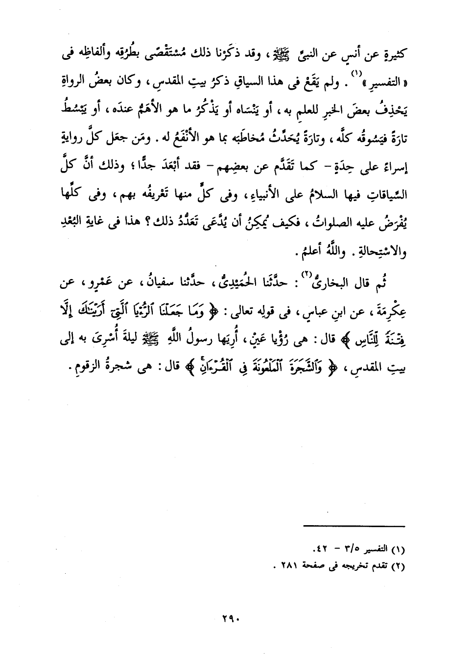 ثُمَّ قَالَ الْبُخَارِيُّ: حَدَّثَنَا الْحُمَيْدِيُّ حَدَّثَنَا سُفْيَانُ عَنْ عَمْرٍو عَنْ عِكْرِمَةَ عَنِ ابْنِ عَبَّاسٍ فِي قَوْلِهِ تَعَالَى: {وَمَا جَعَلْنَا الرُّؤْيَا الَّتِي أَرَيْنَاكَ إِلَّا فِتْنَةً لِلنَّاسِ} [الإسراء: 60] قَالَ: هِيَ رُؤْيَا عَيْنٍ، أُرِيَهَا رَسُولُ اللَّهِ - صَلَّى اللَّهُ عَلَيْهِ وَسَلَّمَ - لَيْلَةَ أُسَرِيَ بِهِ إِلَى بَيْتِ الْمَقْدِسِ، {وَالشَّجَرَةَ الْمَلْعُونَةَ فِي الْقُرْآنِ} [الإسراء: 60] قَالَ: هِيَ شَجَرَةُ الزَّقُّومِ.