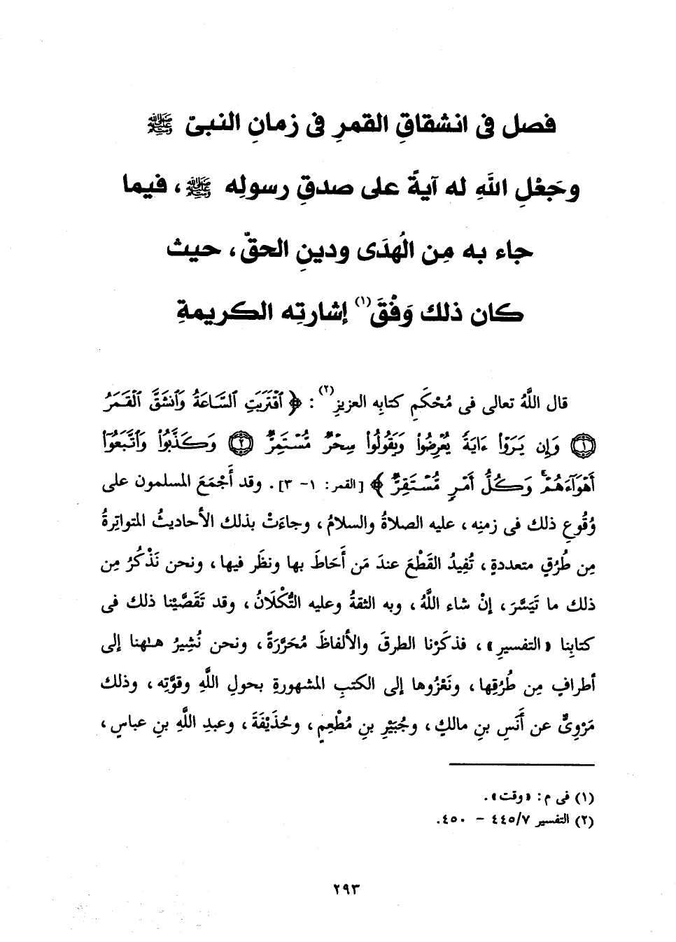قَالَ اللَّهُ تَعَالَى فِي مُحْكَمِ كِتَابِهِ الْعَزِيزِ: {اقْتَرَبَتِ السَّاعَةُ وَانْشَقَّ الْقَمَرُ وَإِنْ يَرَوْا آيَةً يُعْرِضُوا وَيَقُولُوا سِحْرٌ مُسْتَمِرٌّ وَكَذَّبُوا وَاتَّبَعُوا أَهْوَاءَهُمْ وَكُلُّ أَمْرٍ مُسْتَقِرٌّ} [القمر: 1] . وَقَدْ أَجْمَعَ الْمُسْلِمُونَ عَلَى وُقُوعِ ذَلِكَ فِي زَمَنِهِ عَلَيْهِ الصَّلَاةُ وَالسَّلَامُ، وَجَاءَتْ بِذَلِكَ الْأَحَادِيثُ الْمُتَوَاتِرَةُ مَنْ طُرُقٍ مُتَعَدِّدَةٍ تُفِيدُ الْقَطْعَ عِنْدَ مَنْ أَحَاطَ بِهَا وَنَظَرَ فِيهَا، وَنَحْنُ نَذْكُرُ مِنْ ذَلِكَ مَا تَيَسَّرَ، إِنْ شَاءَ اللَّهُ، وَبِهِ الثِّقَةُ، وَعَلَيْهِ التُّكْلَانُ، وَقَدْ تَقَصَّيْنَا ذَلِكَ فِي كِتَابِنَا " التَّفْسِيرِ " فَذَكَرْنَا الطُّرُقَ وَالْأَلْفَاظَ مُحَرَّرَةً. وَنَحْنُ نُشِيرُ هَاهُنَا إِلَى أَطْرَافٍ مِنْ طُرُقِهَا، وَنَعْزُوهَا إِلَى الْكُتُبِ الْمَشْهُورَةِ بِحَوْلِ اللَّهِ وَقُوَّتِهِ، وَذَلِكَ مَرْوِيٌّ عَنْ أَنَسِ بْنِ مَالِكٍ وَجُبَيْرِ بْنِ مُطْعِمٍ وَحُذَيْفَةَ وَعَبْدِ اللَّهِ بْنِ عَبَّاسٍ