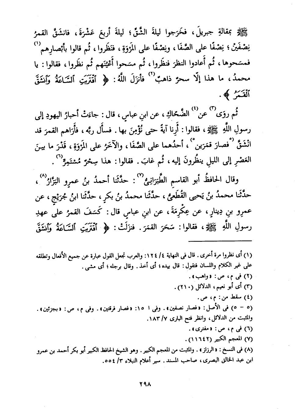 ثُمَّ رَوَى عَنِ الضَّحَّاكِ عَنِ ابْنِ عَبَّاسٍ قَالَ «جَاءَتْ أَحْبَارُ الْيَهُودِ إِلَى رَسُولِ اللَّهِ - صَلَّى اللَّهُ عَلَيْهِ وَسَلَّمَ - فَقَالُوا أَرِنَا آيَةً حَتَّى نُؤْمِنَ بِهَا، فَسَأَلَ رَبَّهُ، فَأَرَاهُمُ الْقَمَرَ فَصَارَ قَمَرَيْنِ، أَحَدُهُمَا عَلَى الصَّفَا وَالْآخَرُ عَلَى الْمَرْوَةِ قَدْرَ مَا بَيْنَ الْعَصْرِ إِلَى اللَّيْلِ يَنْظُرُونَ إِلَيْهِ، ثُمَّ غَابَ. فَقَالُوا: هَذَا سِحْرٌ مُسْتَمِرٌّ.»
