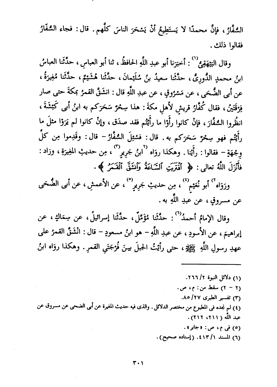 وَقَالَ الْبَيْهَقِيُّ: أَخْبَرَنَا أَبُو عَبْدِ اللَّهِ الْحَافِظُ، حَدَّثَنَا أَبُو الْعَبَّاسِ، حَدَّثَنَا الْعَبَّاسُ بْنُ مُحَمَّدٍ الدُّورِيُّ، حَدَّثَنَا سَعِيدُ بْنُ سُلَيْمَانَ، حَدَّثَنَا هُشَيْمٌ، حَدَّثَنَا مُغِيرَةُ، عَنْ أَبِي الضُّحَى، عَنْ مَسْرُوقٍ، عَنْ عَبْدِ اللَّهِ، قَالَ: «انْشَقَّ الْقَمَرُ بِمَكَّةَ حَتَّى صَارَ فِرْقَتَيْنِ، فَقَالَ كُفَّارُ قُرَيْشٍ لِأَهْلِ مَكَّةَ: هَذَا سِحْرٌ سَحَرَكُمْ بِهِ ابْنُ أَبِي كَبْشَةَ، انْظُرُوا السُّفَّارَ، فَإِنْ كَانُوا رَأَوْا مَا رَأَيْتُمْ فَقَدْ صَدَقَ، وَإِنْ كَانُوا لَمْ يَرَوْا مِثْلَ مَا رَأَيْتُمْ فَهُوَ سِحْرٌ سَحَرَكُمْ بِهِ. قَالَ: فَسُئِلَ السُّفَّارُ - قَالَ وَقَدِمُوا مِنْ كُلِّ وِجْهَةٍ - فَقَالُوا: رَأَيْنَا» . وَهَكَذَا رَوَاهُ ابْنُ جَرِيرٍ، مِنْ حَدِيثِ الْمُغِيرَةِ، وَزَادَ: فَأَنْزَلَ اللَّهُ تَعَالَى: {اقْتَرَبَتِ السَّاعَةُ وَانْشَقَّ الْقَمَرُ} [القمر: 1]