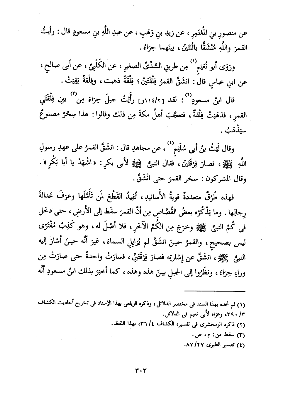 فَهَذِهِ طُرُقٌ مُتَعَدِّدَةٌ قَوِيَّةُ الْأَسَانِيدِ، تُفِيدُ الْقَطْعَ لِمَنْ تَأَمَّلَهَا وَعَرَفَ عَدَالَةَ رِجَالِهَا. وَمَا يَذْكُرُهُ بَعْضُ الْقُصَّاصِ مِنْ أَنَّ الْقَمَرَ سَقَطَ إِلَى الْأَرْضِ، حَتَّى دَخَلَ فِي كُمِّ النَّبِيِّ صَلَّى اللَّهُ عَلَيْهِ وَسَلَّمَ، وَخَرَجَ مِنَ الْكُمِّ الْآخَرِ، فَلَا أَصْلَ لَهُ، وَهُوَ كَذِبٌ مُفْتَرًى، لَيْسَ بِصَحِيحٍ، وَالْقَمَرُ حِينَ انْشَقَّ لَمْ يُزَايِلِ السَّمَاءَ، غَيْرَ أَنَّهُ حِينَ أَشَارَ إِلَيْهِ النَّبِيُّ صَلَّى اللَّهُ عَلَيْهِ وَسَلَّمَ انْشَقَّ عَنْ إِشَارَتِهِ، فَصَارَ فِرْقَتَيْنِ، فَسَارَتْ وَاحِدَةٌ حَتَّى صَارَتْ مِنْ وَرَاءِ حِرَاءَ، وَنَظَرُوا إِلَى الْجَبَلِ بَيْنَ هَذِهِ وَهَذِهِ، كَمَا أَخْبَرَ بِذَلِكَ ابْنُ مَسْعُودٍ أَنَّهُ