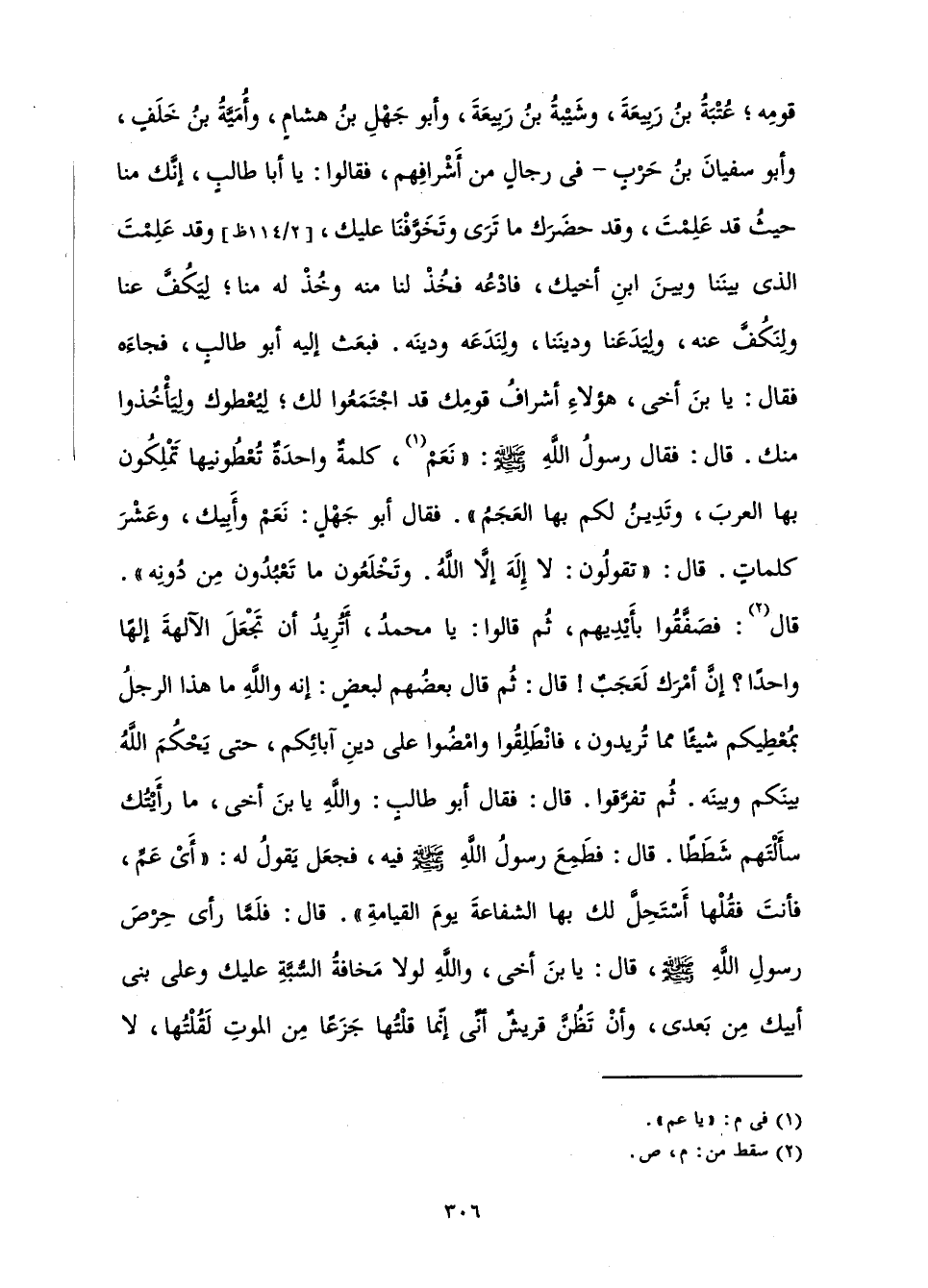 قَوْمِهِ; عُتْبَةُ بْنُ رَبِيعَةَ، وَشَيْبَةُ بْنُ رَبِيعَةَ، وَأَبُو جَهْلِ بْنُ هِشَامٍ، وَأُمَيَّةُ بْنُ خَلَفٍ، وَأَبُو سُفْيَانَ بْنُ حَرْبٍ، فِي رِجَالٍ مِنْ أَشْرَافِهِمْ، فَقَالُوا: يَا أَبَا طَالِبٍ، إِنَّكَ مِنَّا حَيْثُ قَدْ عَلِمْتَ، وَقَدْ حَضَرَكَ مَا تَرَى وَتَخَوَّفْنَا عَلَيْكَ، وَقَدْ عَلِمْتَ الَّذِي بَيْنَنَا وَبَيْنَ ابْنِ أَخِيكَ، فَادْعُهُ فَخُذْ لَنَا مِنْهُ وَخُذْ لَهُ مِنَّا; لِيَكُفَّ عَنَّا، وَلِنَكُفَّ عَنْهُ، وَلِيَدَعَنَا وَدِينَنَا، وَلِنَدَعَهُ وَدِينَهُ. فَبَعَثَ إِلَيْهِ أَبُو طَالِبٍ، فَجَاءَهُ، فَقَالَ: يَا ابْنَ أَخِي، هَؤُلَاءِ أَشْرَافُ قَوْمِكَ قَدِ اجْتَمَعُوا لَكَ، لِيُعْطُوكَ وَلِيَأْخُذُوا مِنْكَ. قَالَ: فَقَالَ رَسُولُ اللَّهِ صَلَّى اللَّهُ عَلَيْهِ وَسَلَّمَ: " نَعَمْ، كَلِمَةٌ وَاحِدَةٌ تُعْطُونِيهَا، تَمْلِكُونَ بِهَا الْعَرَبَ، وَتَدِينُ لَكُمْ بِهَا الْعَجَمُ ". فَقَالَ أَبُو جَهْلٍ: نَعَمْ وَأَبِيكَ، وَعَشْرَ كَلَمَّاتٍ. قَالَ: " تَقُولُونَ: لَا إِلَهَ إِلَّا اللَّهُ، وَتَخْلَعُونَ مَا تَعْبُدُونَ مِنْ دُونِهِ ". قَالَ: فَصَفَّقُوا بِأَيْدِيهِمْ، ثُمَّ قَالُوا: يَا مُحَمَّدُ، أَتُرِيدُ أَنْ تَجْعَلَ الْآلِهَةَ إِلَهًا وَاحِدًا، إِنَّ أَمْرَكَ لَعَجَبٌ! قَالَ: ثُمَّ قَالَ بَعْضُهُمْ لِبَعْضٍ: إِنَّهُ وَاللَّهِ مَا هَذَا الرَّجُلُ بِمُعْطِيكُمْ شَيْئًا مِمَّا تُرِيدُونَ، فَانْطَلِقُوا وَامْضُوا عَلَى دِينِ آبَائِكُمْ، حَتَّى يَحْكُمَ اللَّهُ بَيْنَكُمْ وَبَيْنَهُ، ثُمَّ تَفَرَّقُوا. قَالَ: فَقَالَ أَبُو طَالِبٍ: وَاللَّهِ يَا ابْنَ أَخِي، مَا رَأَيْتُكَ سَأَلْتَهُمْ شَطَطًا. قَالَ: فَطَمِعَ رَسُولُ اللَّهِ صَلَّى اللَّهُ عَلَيْهِ وَسَلَّمَ فِيهِ، فَجَعَلَ يَقُولُ لَهُ: أَيْ عَمِّ، فَأَنْتَ فَقُلْهَا، أَسْتَحِلُّ لَكَ بِهَا الشَّفَاعَةَ يَوْمَ الْقِيَامَةِ، قَالَ: فَلَمَّا رَأَى حِرْصَ رَسُولِ اللَّهِ صَلَّى اللَّهُ عَلَيْهِ وَسَلَّمَ، قَالَ: يَا ابْنَ أَخِي، وَاللَّهِ لَوْلَا مَخَافَةُ السُّبَّةِ عَلَيْكَ، وَعَلَى بَنِي أَبِيكَ مِنْ بَعْدِي، وَأَنْ تَظُنَّ قُرَيْشٌ أَنِّي إِنَّمَا قُلْتُهَا جَزَعًا مِنَ الْمَوْتِ، لَقُلْتُهَا، لَا