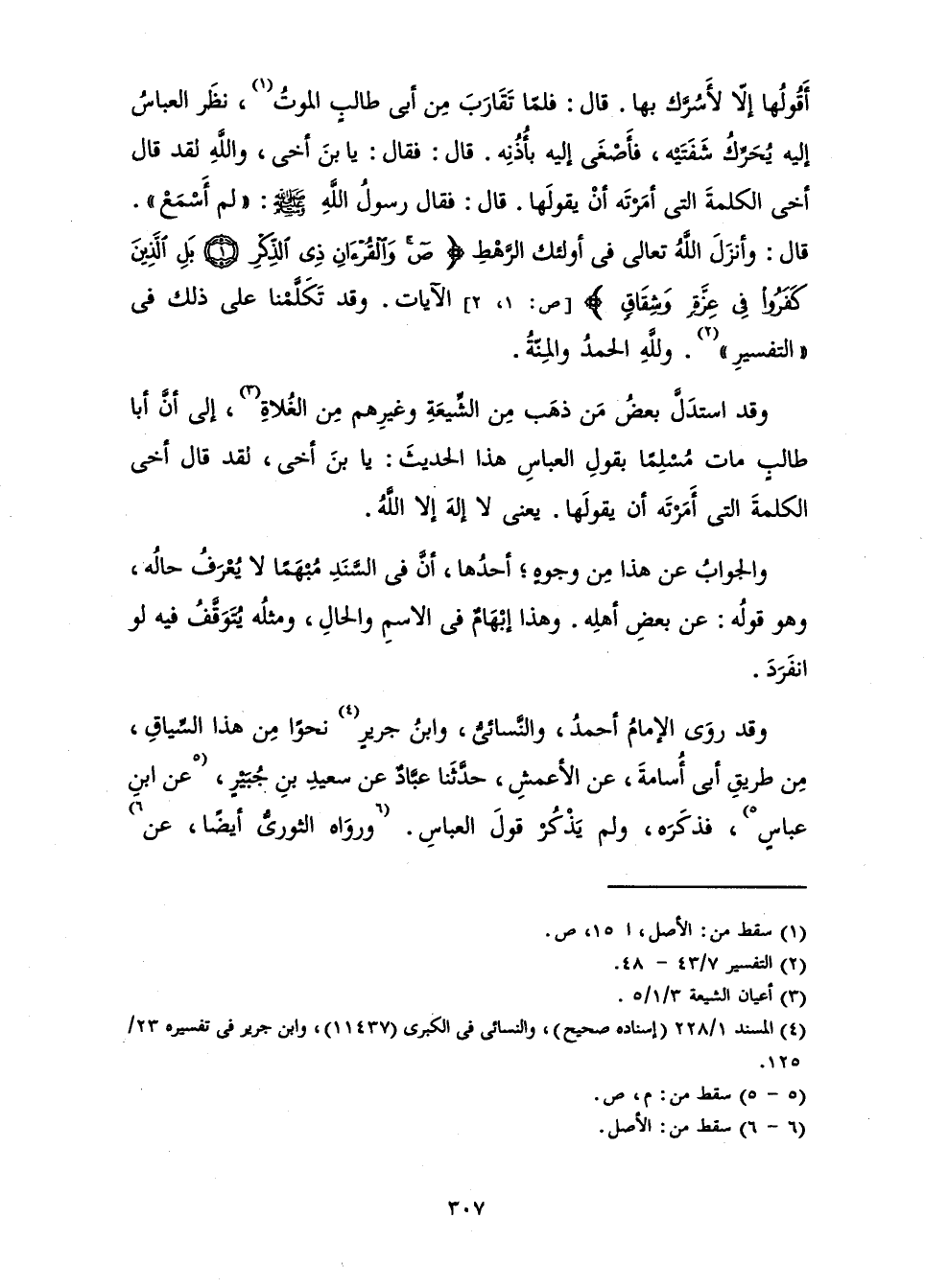 أَقُولُهَا إِلَّا لِأَسُرَّكَ بِهَا. قَالَ: فَلَمَّا تَقَارَبَ مِنْ أَبِي طَالِبٍ الْمَوْتُ، نَظَرَ الْعَبَّاسُ إِلَيْهِ يُحَرِّكُ شَفَتَيْهِ، فَأَصْغَى إِلَيْهِ بِأُذُنِهِ. قَالَ: فَقَالَ: يَا ابْنَ أَخِي، وَاللَّهِ لَقَدْ قَالَ أَخِي الْكَلِمَةَ التِي أَمَرْتَهُ أَنْ يَقُولَهَا. قَالَ: فَقَالَ رَسُولُ اللَّهِ صَلَّى اللَّهُ عَلَيْهِ وَسَلَّمَ: لَمْ أَسْمَعْ. قَالَ: وَأَنْزَلَ اللَّهُ تَعَالَى فِي أُولَئِكَ الرَّهْطِ: {ص وَالْقُرْآنِ ذِي الذِّكْرِ بَلِ الَّذِينَ كَفَرُوا فِي عِزَّةٍ وَشِقَاقٍ} [ص: 1]