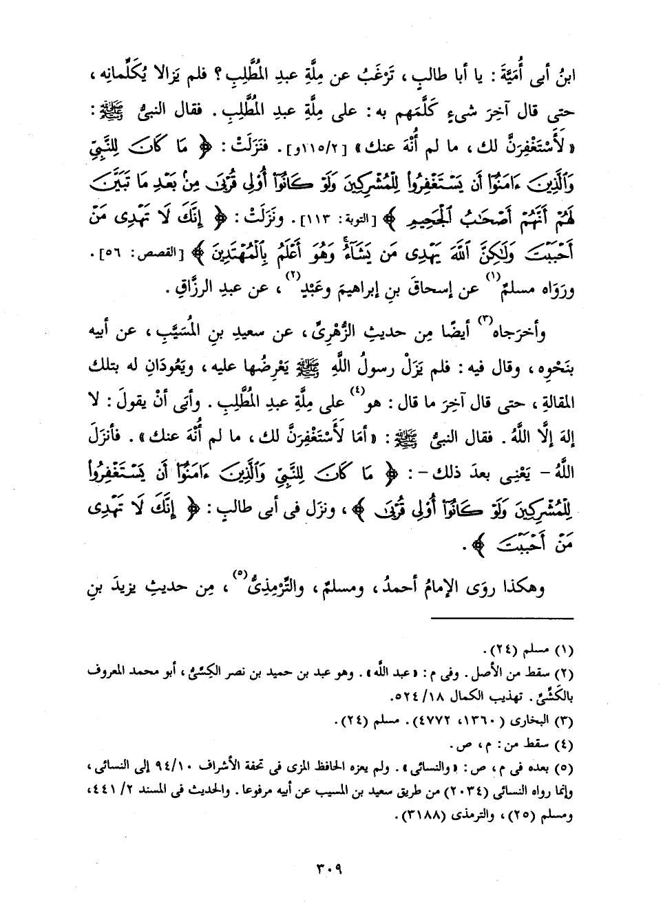 بْنُ أَبِي أُمَيَّةَ: يَا أَبَا طَالِبٍ، تَرْغَبُ عَنْ مِلَّةِ عَبْدِ الْمُطَّلِبِ؟ فَلَمْ يَزَالَا يُكَلَمَّانِهِ، حَتَّى قَالَ آخِرَ شَيْءٍ كَلَّمَهُمْ بِهِ: عَلَى مِلَّةِ عَبْدِ الْمُطَّلِبِ. فَقَالَ النَّبِيُّ صَلَّى اللَّهُ عَلَيْهِ وَسَلَّمَ: " لَأَسْتَغْفِرَنَّ لَكَ مَا لَمْ أُنْهَ عَنْكَ ".» فَنَزَلَتْ {مَا كَانَ لِلنَّبِيِّ وَالَّذِينَ آمَنُوا أَنْ يَسْتَغْفِرُوا لِلْمُشْرِكِينَ وَلَوْ كَانُوا أُولِي قُرْبَى مِنْ بَعْدِ مَا تَبَيَّنَ لَهُمْ أَنَّهُمْ أَصْحَابُ الْجَحِيمِ} [التوبة: 113] وَنَزَلَتْ: {إِنَّكَ لَا تَهْدِي مَنْ أَحْبَبْتَ وَلَكِنَّ اللَّهَ يَهْدِي مَنْ يَشَاءُ وَهُوَ أَعْلَمُ بِالْمُهْتَدِينَ} [القصص: 56] وَرَوَاهُ مُسْلِمٌ، عَنْ إِسْحَاقَ بْنِ إِبْرَاهِيمَ وَعَبْدٍ، عَنْ عَبْدِ الرَّزَّاقِ.