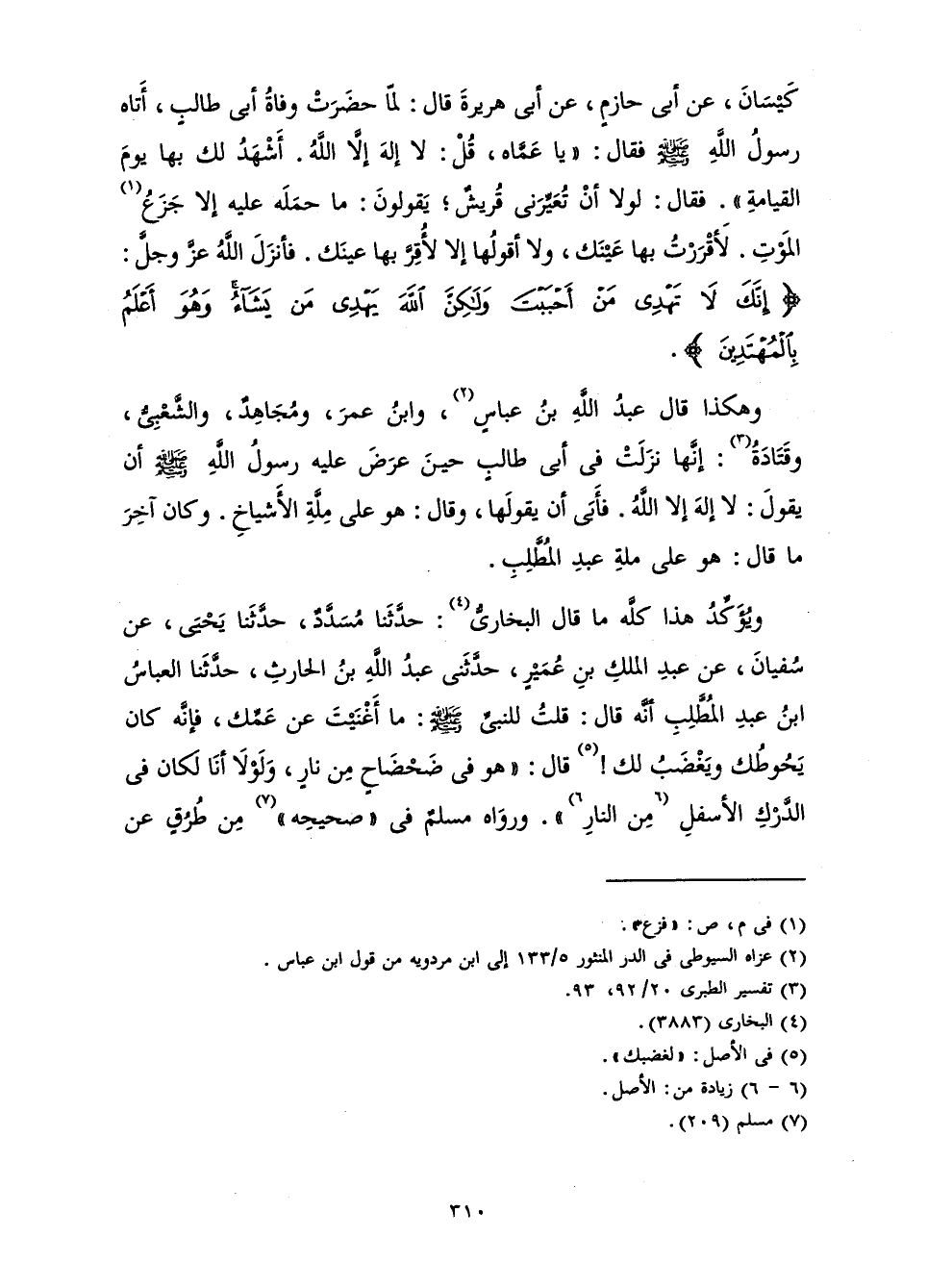 وَيُؤَكِّدُ هَذَا كُلَّهُ مَا قَالَ الْبُخَارِيُّ: حَدَّثَنَا مُسَدَّدٌ، حَدَّثَنَا يَحْيَى، عَنْ سُفْيَانَ، عَنْ عَبْدِ الْمَلِكِ بْنِ عُمَيْرٍ، حَدَّثَنِي عَبْدُ اللَّهِ بْنُ الْحَارِثِ، حَدَّثَنَا الْعَبَّاسُ بْنُ عَبْدِ الْمُطَّلِبِ، أَنَّهُ قَالَ: «قَلْتُ لِلنَّبِيِّ صَلَّى اللَّهُ عَلَيْهِ وَسَلَّمَ: مَا أَغْنَيْتَ عَنْ عَمِّكَ، فَإِنَّهُ كَانَ يَحُوطُكَ وَيَغْضَبُ لَكَ. قَالَ: هُوَ فِي ضَحْضَاحٍ مِنْ نَارٍ، وَلَوْلَا أَنَا لَكَانَ فِي الدَّرْكِ الْأَسْفَلِ مِنَ النَّارِ ".» وَرَوَاهُ مُسْلِمٌ فِي " صَحِيحِهِ " مِنْ طُرُقٍ عَنْ