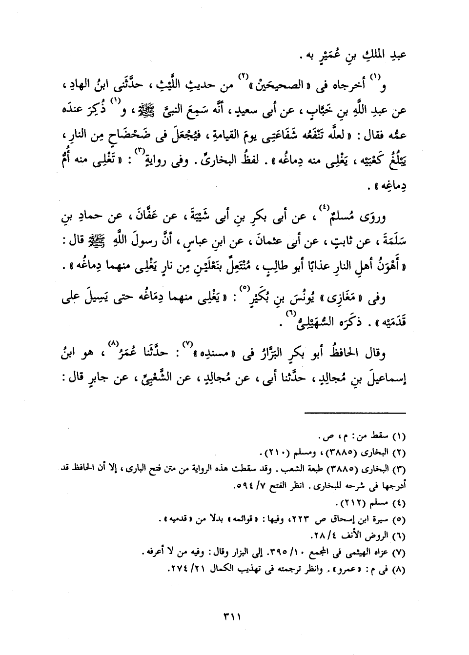 وَأَخْرَجَاهُ فِي " الصَّحِيحَيْنِ " مِنْ حَدِيثِ اللَّيْثِ، حَدَّثَنِي ابْنُ الْهَادِ، عَنْ عَبْدِ اللَّهِ بْنِ خَبَّابٍ، عَنْ أَبِي سَعِيدٍ، أَنَّهُ «سَمِعَ النَّبِيَّ صَلَّى اللَّهُ عَلَيْهِ وَسَلَّمَ، وَذُكِرَ عِنْدَهُ عَمُّهُ، فَقَالَ: " لَعَلَّهُ تَنْفَعُهُ شَفَاعَتِي يَوْمَ الْقِيَامَةِ، فَيُجْعَلُ فِي ضَحْضَاحٍ مِنَ النَّارِ، يَبْلُغُ كَعْبَيْهِ، يَغْلِي مِنْهُ دِمَاغُهُ ".» لَفْظُ الْبُخَارِيِّ، وَفِي رِوَايَةٍ: «تَغْلِي مِنْهُ أُمُّ دِمَاغِهِ ".»