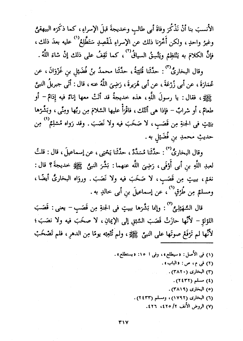 وَقَالَ الْبُخَارِيُّ: حَدَّثَنَا مُسَدَّدٌ، حَدَّثَنَا يَحْيَى، عَنْ إِسْمَاعِيلَ، قَالَ: «قُلْتُ لِعَبْدِ اللَّهِ بْنِ أَبِي أَوْفَى، رَضِيَ اللَّهُ عَنْهُمَا: بَشَّرَ النَّبِيُّ صَلَّى اللَّهُ عَلَيْهِ وَسَلَّمَ خَدِيجَةَ؟ قَالَ: نَعَمْ، بِبَيْتٍ مِنْ قَصَبٍ، لَا صَخَبَ فِيهِ وَلَا نَصَبَ.» وَرَوَاهُ الْبُخَارِيُّ أَيْضًا، وَمُسْلِمٌ مِنْ طُرُقٍ، عَنْ إِسْمَاعِيلَ بْنِ أَبِي خَالِدٍ بِهِ.