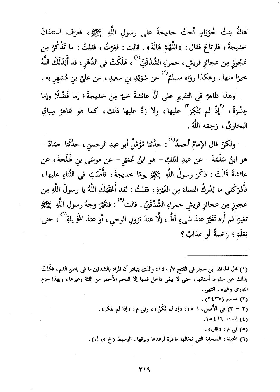 وَلَكِنْ قَالَ الْإِمَامُ أَحْمَدُ: حَدَّثَنَا مُؤَمَّلٌ أَبُو عَبْدِ الرَّحْمَنِ، حَدَّثَنَا حَمَّادٌ - هُوَ ابْنُ سَلَمَةَ -، عَنْ عَبْدِ الْمَلِكِ - هُوَ ابْنُ عُمَيْرٍ -، عَنْ مُوسَى بْنِ طَلْحَةَ، عَنْ عَائِشَةَ، قَالَتْ: «ذَكَرَ رَسُولُ اللَّهِ صَلَّى اللَّهُ عَلَيْهِ وَسَلَّمَ يَوْمًا خَدِيجَةَ فَأَطْنَبَ فِي الثَّنَاءِ عَلَيْهَا، فَأَدْرَكَنِي مَا يُدْرِكُ النِّسَاءَ مِنَ الْغَيْرَةِ، فَقُلْتُ: لَقَدْ أَعْقَبَكَ اللَّهُ يَا رَسُولَ اللَّهِ مِنْ عَجُوزٍ مِنْ عَجَائِزِ قُرَيْشٍ حَمْرَاءِ الشِّدْقَيْنِ. قَالَتْ: فَتَغَيَّرَ وَجْهُ رَسُولِ اللَّهِ صَلَّى اللَّهُ عَلَيْهِ وَسَلَّمَ تَغَيُّرًا لَمْ أَرَهُ تَغَيَّرَ عِنْدَ شَيْءٍ قَطُّ، إِلَّا عِنْدَ نُزُولِ الْوَحْيِ، أَوْ عِنْدَ الْمَخِيلَةِ حَتَّى يَعْلَمَ، رَحْمَةٌ أَوْ عَذَابٌ»