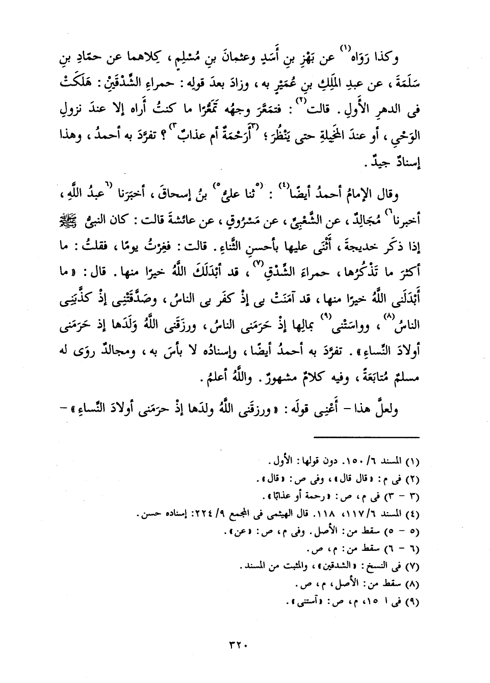 وَقَالَ الْإِمَامُ أَحْمَدُ أَيْضًا: ثَنَا عَلِيُّ بْنُ إِسْحَاقَ، أَخْبَرَنَا عَبْدُ اللَّهِ، أَخْبَرَنَا مُجَالِدٌ، عَنِ الشَّعْبِيِّ، عَنْ مَسْرُوقٍ، عَنْ عَائِشَةَ، قَالَتْ: «كَانَ النَّبِيُّ صَلَّى اللَّهُ عَلَيْهِ وَسَلَّمَ إِذَا ذَكَرَ خَدِيجَةَ أَثْنَى عَلَيْهَا بِأَحْسَنِ الثَّنَاءِ، قَالَتْ: فَغِرْتُ يَوْمًا. فَقُلْتُ: مَا أَكْثَرَ مَا تَذْكُرُهَا، حَمْرَاءُ الشِّدْقِ، قَدْ أَبْدَلَكَ اللَّهُ خَيْرًا مِنْهَا. قَالَ: " مَا أَبْدَلَنِي اللَّهُ خَيْرًا مِنْهَا، قَدْ آمَنَتْ بِي إِذْ كَفَرَ بِي النَّاسُ، وَصَدَقَتْنِي إِذْ كَذَّبَنِي النَّاسُ، وَوَاسَتْنِي بِمَالِهَا إِذْ حَرَمَنِي النَّاسُ، وَرَزَقَنِي اللَّهُ وَلَدَهَا إِذْ حَرَمَنِي أَوْلَادَ النِّسَاءِ ".» تَفَرَّدَ بِهِ أَحْمَدُ أَيْضًا، وَإِسْنَادُهُ لَا بَأْسَ بِهِ، وَمُجَالِدٌ رَوَى لَهُ مُسْلِمٌ مُتَابَعَةً، وَفِيهِ كَلَامٌ مَشْهُورٌ. وَاللَّهُ أَعْلَمُ.