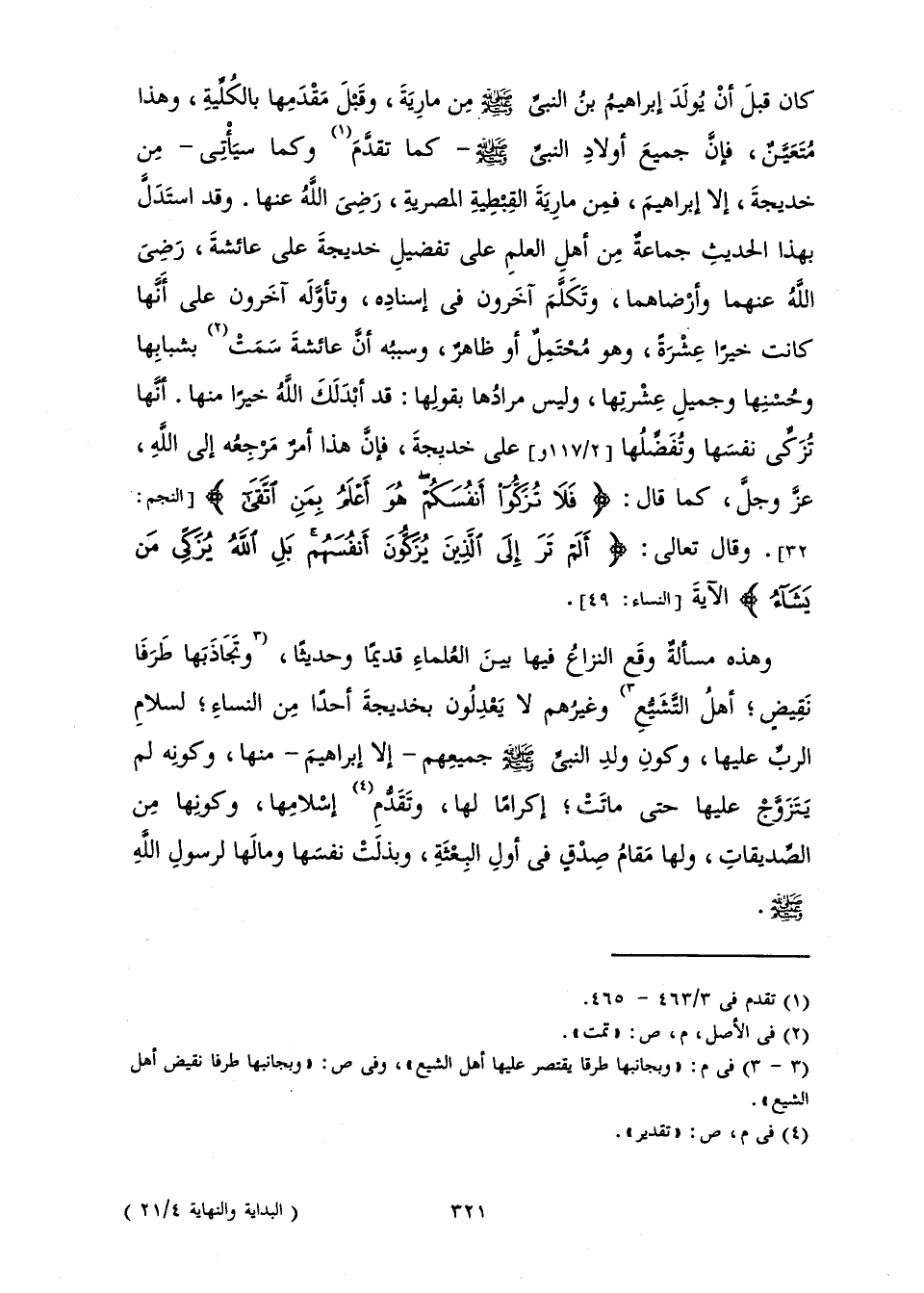 وَهَذِهِ مَسْأَلَةٌ وَقَعَ النِّزَاعُ فِيهَا بَيْنَ الْعُلَمَاءِ قَدِيمًا وَحَدِيثًا، وَتَجَاذَبَهَا طَرَفَا نَقِيضٍ; أَهِلُ التَّشَيُّعِ وَغَيْرُهُمْ، لَا يَعْدِلُونَ بِخَدِيجَةَ أَحَدًا مِنَ النِّسَاءِ، لِسَلَامِ الرَّبِّ عَلَيْهَا، وَكَوْنِ وَلَدِ النَّبِيِّ صَلَّى اللَّهُ عَلَيْهِ وَسَلَّمَ جَمِيعِهِمْ - إِلَّا إِبْرَاهِيمَ - مِنْهَا، وَكَوْنِهِ لَمْ يَتَزَوَّجْ عَلَيْهَا حَتَّى مَاتَتْ; إِكْرَامًا لَهَا، وَتَقَدُّمِ إِسْلَامِهَا، وَكَوْنِهَا مِنَ الصِّدِّيقَاتِ، وَلَهَا مَقَامُ صِدْقٍ فِي أَوَّلِ الْبِعْثَةِ، وَبَذَلَتْ نَفْسَهَا وَمَالَهَا لِرَسُولِ اللَّهِ صَلَّى اللَّهُ عَلَيْهِ وَسَلَّمَ.
