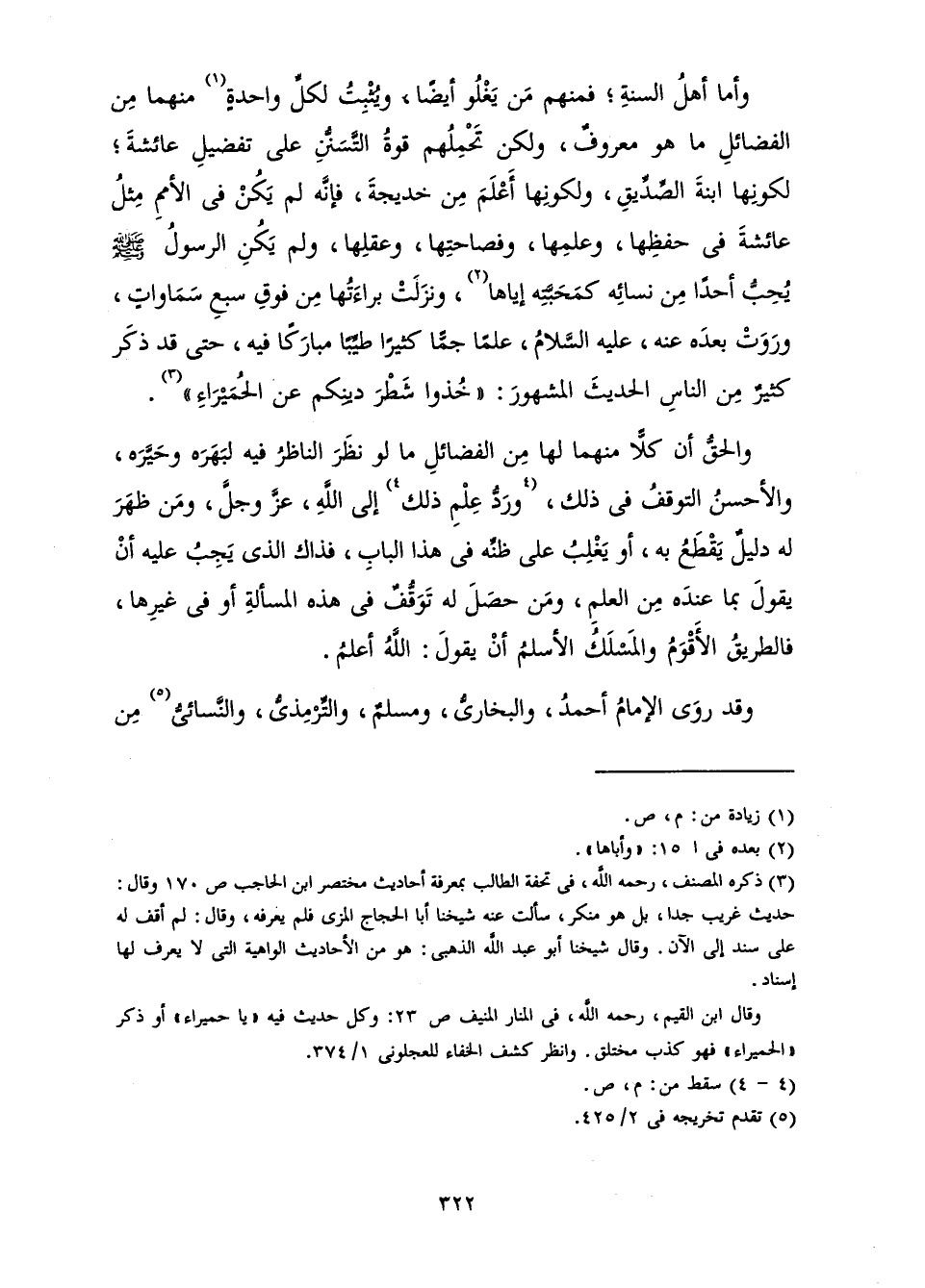 وَأَمَّا أَهْلُ السُّنَّةِ; فَمِنْهُمْ مَنْ يَغْلُو أَيْضًا، وَيُثْبِتُ لِكُلِّ وَاحِدَةٍ مِنْهُمَا مِنَ الْفَضَائِلِ مَا هُوَ مَعْرُوفٌ، وَلَكِنْ تَحْمِلُهُمْ قُوَّةُ التَّسَنُّنِ عَلَى تَفْضِيلِ عَائِشَةَ; لِكَوْنِهَا ابْنَةَ الصِّدِّيقِ، وَلِكَوْنِهَا أَعْلَمَ مِنْ خَدِيجَةَ، فَإِنَّهُ لَمْ يَكُنْ فِي الْأُمَمِ مِثْلُ عَائِشَةَ فِي حِفْظِهَا وَعِلْمِهَا وَفَصَاحَتِهَا وَعَقْلِهَا، وَلَمْ يَكُنِ الرَّسُولُ صَلَّى اللَّهُ عَلَيْهِ وَسَلَّمَ يُحِبُّ أَحَدًا مِنْ نِسَائِهِ كَمَحَبَّتِهِ إِيَّاهَا، وَنَزَلَتْ بَرَاءَتُهَا مِنْ فَوْقِ سَبْعِ سَمَاوَاتٍ، وَرَوَتْ بَعْدَهُ عَنْهُ، عَلَيْهِ السَّلَامُ، عِلْمًا جَمًّا كَثِيرًا طَيِّبًا مُبَارَكًا فِيهِ، حَتَّى قَدْ ذَكَرَ كَثِيرٌ مِنَ النَّاسِ الْحَدِيثَ الْمَشْهُورَ: «خُذُوا شَطْرَ دِينِكُمْ عَنِ الْحُمَيْرَاءِ»