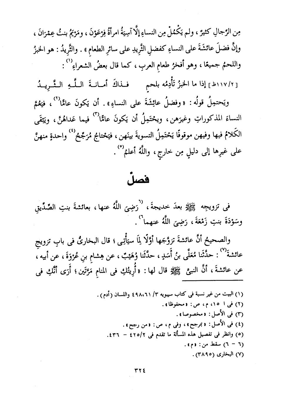 مِنَ الرِّجَالِ كَثِيرٌ، وَلَمْ يَكْمُلْ مِنَ النِّسَاءِ إِلَّا آسِيَةُ امْرَأَةُ فِرْعَوْنَ، وَمَرْيَمُ بِنْتُ عِمْرَانَ، وَإِنَّ فَضْلَ عَائِشَةَ عَلَى النِّسَاءِ، كَفَضْلِ الثَّرِيدِ عَلَى سَائِرِ الطَّعَامِ ".» وَالثَّرِيدُ: هُوَ الْخَبْزُ وَاللَّحْمُ جَمِيعًا، وَهُوَ أَفْخَرُ طَعَامِ الْعَرَبِ، كَمَا قَالَ بَعْضُ الشُّعَرَاءِ: