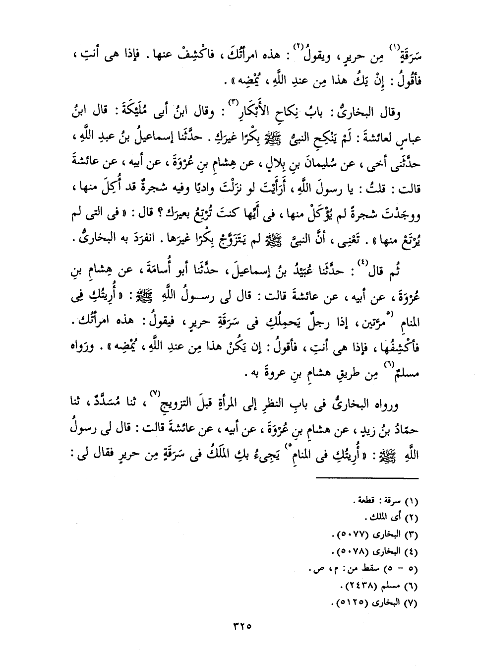 وَرَوَاهُ الْبُخَارِيُّ فِي بَابِ النَّظَرِ إِلَى الْمَرْأَةِ قَبْلَ التَّزْوِيجِ، ثَنَا مُسَدَّدٌ، ثَنَا حَمَّادُ بْنُ زَيْدٍ، عَنْ هِشَامِ بْنِ عُرْوَةَ، عَنْ أَبِيهِ، عَنْ عَائِشَةَ، قَالَتْ: «قَالَ لِي رَسُولُ اللَّهِ صَلَّى اللَّهُ عَلَيْهِ وَسَلَّمَ: أُرِيتُكِ فِي الْمَنَامِ يَجِيءُ بِكِ الْمَلَكُ فِي سَرَقَةٍ مِنْ حَرِيرٍ، فَقَالَ لِي: