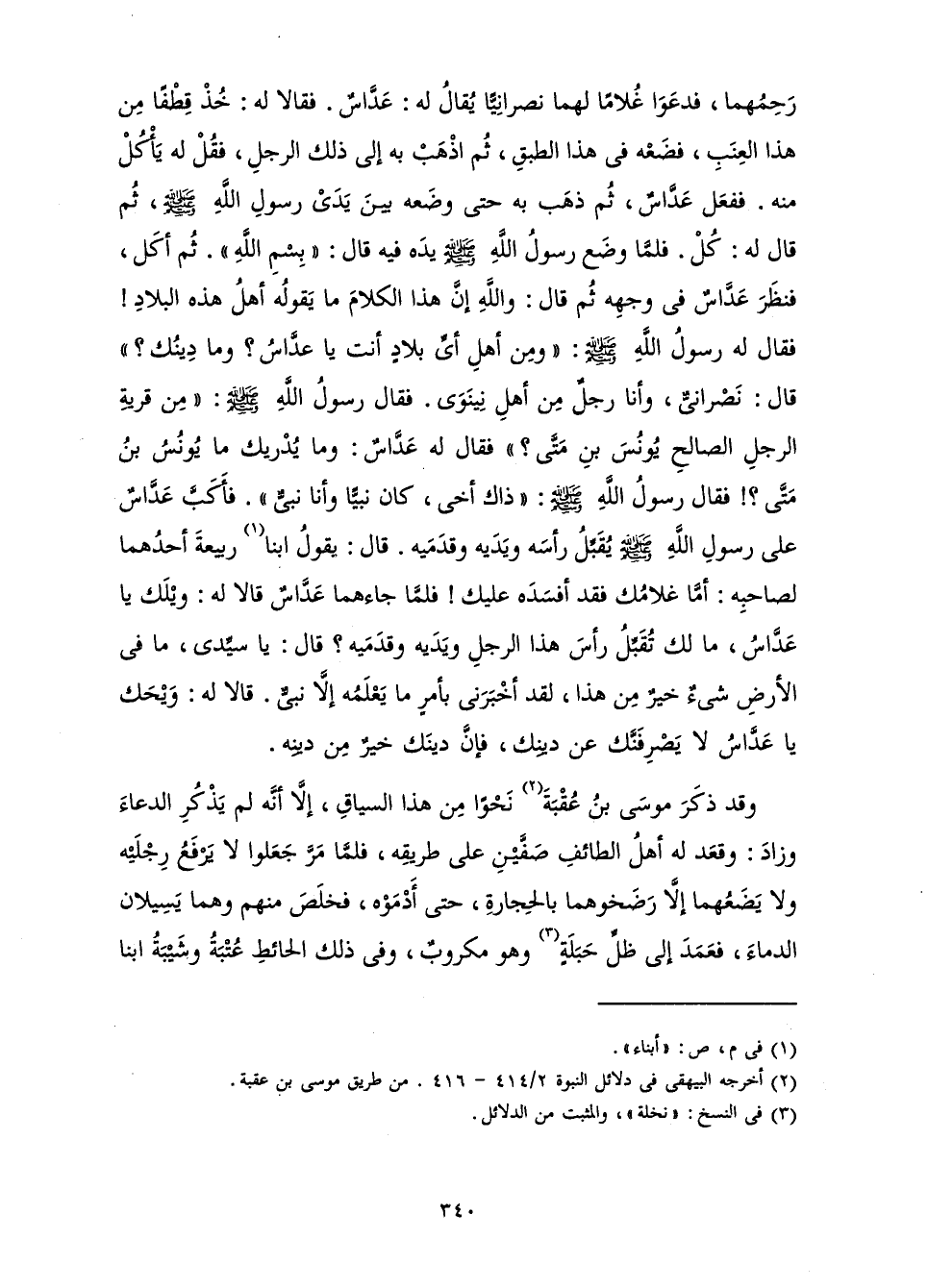 رَحِمُهُمَا، فَدَعَوَا غُلَامًا نَصْرَانِيًّا يُقَالُ لَهُ: عَدَّاسٌ. فَقَالَا لَهُ: خُذْ قِطْفًا مِنْ هَذَا الْعِنَبِ، فَضَعْهُ فِي هَذَا الطَّبَقِ، ثُمَّ اذْهَبْ بِهِ إِلَى ذَلِكَ الرَّجُلِ، فَقُلْ لَهُ يَأْكُلُ مِنْهُ، فَفَعَلَ عَدَّاسٌ، ثُمَّ ذَهَبَ بِهِ حَتَّى وَضَعَهُ بَيْنَ يَدَيْ رَسُولِ اللَّهِ صَلَّى اللَّهُ عَلَيْهِ وَسَلَّمَ، ثُمَّ قَالَ لَهُ: كُلْ. فَلَمَّا وَضَعَ رَسُولُ اللَّهِ صَلَّى اللَّهُ عَلَيْهِ وَسَلَّمَ يَدَهُ فِيهِ، قَالَ: " بِسْمِ اللَّهِ "، ثُمَّ أَكَلَ، فَنَظَرَ عَدَّاسٌ فِي وَجْهِهِ، ثُمَّ قَالَ: وَاللَّهِ إِنَّ هَذَا الْكَلَامَ مَا يَقُولُهُ أَهْلُ هَذِهِ الْبِلَادِ! فَقَالَ لَهُ رَسُولُ اللَّهِ صَلَّى اللَّهُ عَلَيْهِ وَسَلَّمَ: " وَمِنْ أَهْلِ أَيِّ بِلَادٍ أَنْتَ يَا عَدَّاسُ؟ وَمَا دِينُكَ؟ ". قَالَ: نَصْرَانِيٌّ، وَأَنَا رَجُلٌ مِنْ أَهْلِ نِينَوَى. فَقَالَ رَسُولُ اللَّهِ صَلَّى اللَّهُ عَلَيْهِ وَسَلَّمَ: " مِنْ قَرْيَةِ الرَّجُلِ الصَّالِحِ يُونُسَ بْنِ مَتَّى؟ ". فَقَالَ لَهُ عَدَّاسٌ: وَمَا يُدْرِيكَ مَا يُونُسُ بْنُ مَتَّى؟ ! فَقَالَ رَسُولُ اللَّهِ صَلَّى اللَّهُ عَلَيْهِ وَسَلَّمَ: " ذَلِكَ أَخِي، كَانَ نَبِيًّا وَأَنَا نَبِيٌّ ". فَأَكَبَّ عَدَّاسٌ عَلَى رَسُولِ اللَّهِ صَلَّى اللَّهُ عَلَيْهِ وَسَلَّمَ يُقَبِّلُ رَأْسَهُ وَيَدَيْهِ وَقَدَمَيْهِ. قَالَ: يَقُولُ ابْنَاءُ رَبِيعَةَ أَحَدُهُمَا لِصَاحِبِهِ: أَمَّا غُلَامُكَ فَقَدْ أَفْسَدَهُ عَلَيْكَ. فَلَمَّا جَاءَهُمَا عَدَّاسٌ، قَالَا لَهُ: وَيْلَكَ يَا عَدَّاسُ، مَا لَكَ تُقَبِّلُ رَأْسَ هَذَا الرَّجُلِ وَيَدَيْهِ وَقَدَمَيْهِ؟ قَالَ: يَا سَيِّدِي، مَا فِي الْأَرْضِ شَيْءٌ خَيْرٌ مِنْ هَذَا، لَقَدْ أَخْبَرَنِي بِأَمْرٍ مَا يَعْلَمُهُ إِلَّا نَبِيٌّ. قَالَا لَهُ: وَيْحَكَ يَا عَدَّاسُ، لَا يَصْرِفَنَّكَ عَنْ دِينِكَ; فَإِنَّ دِينَكَ خَيْرٌ مِنْ دِينِهِ.