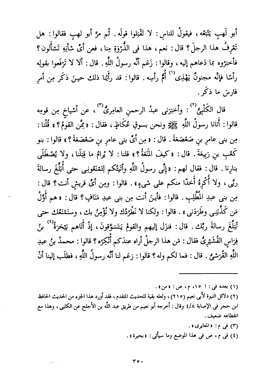 قَالَ الْكَلْبِيُّ: وَأَخْبَرَنِي عَبْدُ الرَّحْمَنِ الْعَامِرِيُّ، عَنْ أَشْيَاخٍ مِنْ قَوْمِهِ، قَالُوا: «أَتَانَا رَسُولُ اللَّهِ صَلَّى اللَّهُ عَلَيْهِ وَسَلَّمَ وَنَحْنُ بِسُوقِ عُكَاظٍ، فَقَالَ: " مِمَّنِ الْقَوْمُ؟ " قُلْنَا: مِنْ بَنِي عَامِرِ بْنِ صَعْصَعَةَ. قَالَ: " مِنْ أَيِّ بَنِي عَامِرِ بْنِ صَعْصَعَةَ؟ " قَالُوا: بَنُو كَعْبِ بْنِ رَبِيعَةَ. قَالَ: " كَيْفَ الْمَنَعَةُ؟ " قُلْنَا: لَا يُرَامُ مَا قِبَلَنَا، وَلَا يُصْطَلَى بِنَارِنَا. قَالَ: فَقَالَ لَهُمْ: " إِنِّي رَسُولُ اللَّهِ، وَأَتَيْتُكُمْ لِتَمْنَعُونِي حَتَّى أُبَلِّغَ رِسَالَةَ رَبِّي، وَلَا أُكْرِهُ أَحَدًا مِنْكُمْ عَلَى شَيْءٍ ". قَالُوا: وَمِنْ أَيِّ قُرَيْشٍ أَنْتَ؟ قَالَ: " مِنْ بَنِي عَبْدِ الْمُطَّلِبِ ". قَالُوا: فَأَيْنَ أَنْتَ مِنْ عَبْدِ مَنَافٍ؟ قَالَ:: " هُمْ أَوَّلُ مَنْ كَذَّبَنِي وَطَرَدَنِي ". قَالُوا: وَلَكِنَّا لَا نَطْرُدُكَ وَلَا نُؤْمِنُ بِكَ، وَسَنَمْنَعُكَ حَتَّى تُبَلِّغَ رِسَالَةَ رَبِّكَ. قَالَ: فَنَزَلَ إِلَيْهِمْ وَالْقَوْمُ يَتَسَوَّقُونَ، إِذْ أَتَاهُمْ بَيْحَرَةُ بْنُ فِرَاسٍ الْقُشَيْرِيُّ، فَقَالَ: مَنْ هَذَا الرَّجُلُ أَرَاهُ عِنْدَكُمْ أُنْكِرُهُ؟ قَالُوا: مُحَمَّدُ بْنُ عَبْدِ اللَّهِ الْقُرَشِيُّ. قَالَ فَمَا لَكَمَ وَلَهُ؟ قَالُوا: زَعَمَ لَنَا أَنَّهُ رَسُولُ اللَّهِ، فَطَلَبَ إِلَيْنَا أَنْ