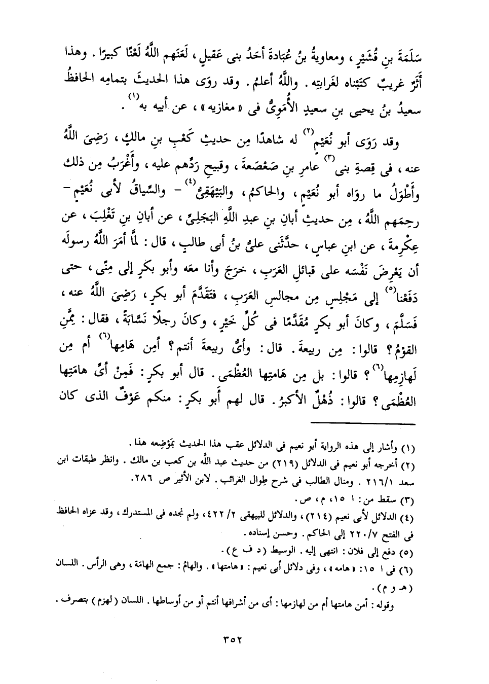 وَقَدْ رَوَى أَبُو نُعَيْمٍ لَهُ شَاهِدًا مِنْ حَدِيثِ كَعْبِ بْنِ مَالِكٍ رَضِيَ اللَّهُ عَنْهُ، فِي قِصَّةِ بَنِي عَامِرِ بْنِ صَعْصَعَةَ، وَقَبِيحِ رَدِّهِمْ عَلَيْهِ، وَأَغْرَبُ مِنْ ذَلِكَ وَأَطْوَلُ مَا رَوَاهُ أَبُو نُعَيْمٍ، وَالْحَاكِمُ، وَالْبَيْهَقِيُّ - وَالسِّيَاقُ لِأَبِي نُعَيْمٍ - رَحِمَهُمُ اللَّهُ مِنْ حَدِيثِ أَبَانِ بْنِ عَبْدِ اللَّهِ الْبَجَلِيِّ، عَنْ أَبَانِ بْنِ تَغْلِبَ، عَنْ عِكْرِمَةَ، عَنِ ابْنِ عَبَّاسٍ، حَدَّثَنِي عَلِيُّ بْنُ أَبِي طَالِبٍ، قَالَ: لَمَّا أَمَرَ اللَّهُ رَسُولَهُ أَنْ يَعْرِضَ نَفْسَهُ عَلَى قَبَائِلِ الْعَرَبِ، خَرَجَ وَأَنَا مَعَهُ وَأَبُو بَكْرٍ إِلَى مِنًى، حَتَّى دَفَعْنَا إِلَى مَجْلِسٍ مِنْ مَجَالِسِ الْعَرَبِ، فَتَقَدَّمَ أَبُو بَكْرٍ رَضِيَ اللَّهُ عَنْهُ فَسَلَّمَ، وَكَانَ أَبُو بَكْرٍ مُقَدَّمًا فِي كُلِّ خَيْرٍ، وَكَانَ رَجُلًا نَسَّابَةً، فَقَالَ: مِمَّنِ الْقَوْمُ؟ قَالُوا: مِنْ رَبِيعَةَ. قَالَ: وَأَيُّ رَبِيعَةَ أَنْتُمْ؟ أَمِنْ هَامِهَا أَمْ مِنْ لَهَازِمِهَا. قَالُوا: بَلْ مِنْ هَامَتِهَا الْعُظْمَى. قَالَ أَبُو بَكْرٍ: فَمَنْ أَيِّ هَامَتِهَا الْعُظْمَى؟ قَالُوا: ذُهْلٌ الْأَكْبَرُ. قَالَ لَهُمْ أَبُو بَكْرٍ: مِنْكُمْ عَوْفٌ الَّذِي كَانَ
