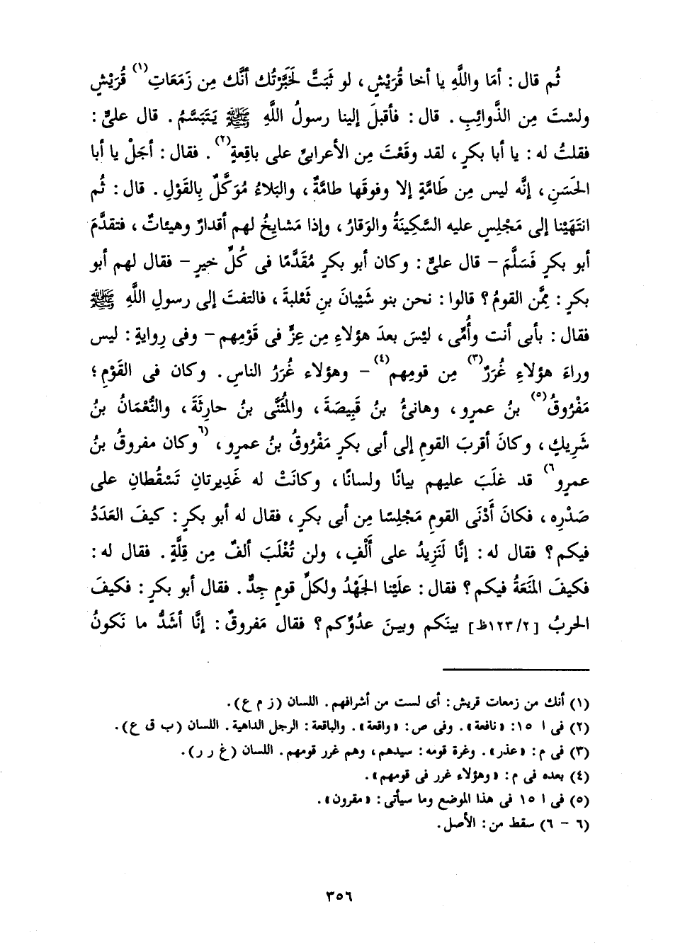 ثُمَّ قَالَ: أَمَا وَاللَّهِ يَا أَخَا قُرَيْشٍ، لَوْ ثَبَتَّ لَخَبَّرْتُكَ أَنَّكَ مِنْ زَمَعَاتِ قُرَيْشٍ وَلَسْتَ مِنَ الذَّوَائِبِ. قَالَ: فَأَقْبَلَ إِلَيْنَا رَسُولُ اللَّهِ صَلَّى اللَّهُ عَلَيْهِ وَسَلَّمَ يَتَبَسَّمُ. قَالَ عَلِيٌّ: فَقُلْتُ لَهُ: يَا أَبَا بَكْرٍ لَقَدْ وَقَعْتَ مِنَ الْأَعْرَابِيِّ عَلَى بَاقِعَةٍ. فَقَالَ: أَجَلْ يَا أَبَا الْحَسَنِ، إِنَّهُ لَيْسَ مِنْ طَامَّةٍ إِلَّا وَفَوْقَهَا طَامَّةٌ، وَالْبَلَاءُ مُوَكَّلٌ بِالْقَوْلِ. قَالَ: ثُمَّ انْتَهَيْنَا إِلَى مَجْلِسٍ عَلَيْهِ السَّكِينَةُ وَالْوَقَارُ، وَإِذَا مَشَايِخُ لَهُمْ أَقْدَارٌ وَهَيْئَاتٌ، فَتُقَدَّمَ أَبُو بَكْرٍ فَسَلَّمَ - قَالَ عَلِيٌّ: وَكَانَ أَبُو بَكْرٍ مُقَدَّمًا فِي كُلِّ خَيْرٍ - فَقَالَ لَهُمْ أَبُو بَكْرٍ: مِمَّنِ الْقَوْمُ؟ قَالُوا: نَحْنُ بَنِي شَيْبَانَ بْنِ ثَعْلَبَةَ، فَالْتَفَتَ إِلَى رَسُولِ اللَّهِ صَلَّى اللَّهُ عَلَيْهِ وَسَلَّمَ، فَقَالَ: بِأَبِي أَنْتَ وَأُمِّي، لَيْسَ بَعْدَ هَؤُلَاءِ مِنْ عِزٍّ فِي قَوْمِهِمْ - وَفِي رِوَايَةٍ: لَيْسَ وَرَاءَ هَؤُلَاءِ غُرَرٌ مِنْ قَوْمِهِمْ - وَهَؤُلَاءِ غُرَرُ النَّاسِ. وَكَانَ فِي الْقَوْمِ; مَفْرُوقُ بْنُ عَمْرٍو، وَهَانِئُ بْنُ قَبِيصَةَ، وَالْمُثَنَّى بْنُ حَارِثَةَ، وَالنُّعْمَانُ بْنُ شَرِيكٍ، وَكَانَ أَقْرَبَ الْقَوْمِ إِلَى أَبِي بَكْرٍ مَفْرُوقُ بْنُ عَمْرٍو، وَكَانَ مَفْرُوقُ بْنُ عَمْرٍو قَدْ غَلَبَ عَلَيْهِمْ بَيَانًا وَلِسَانًا، وَكَانَتْ لَهُ غَدِيرَتَانِ تَسْقُطَانِ عَلَى صَدْرِهِ، فَكَانَ أَدْنَى الْقَوْمِ مَجْلِسًا مِنْ أَبِي بَكْرٍ، فَقَالَ لَهُ أَبُو بَكْرٍ: كَيْفَ الْعَدَدُ فِيكُمْ؟ فَقَالَ لَهُ: إِنَّا لَنَزِيدُ عَلَى أَلْفٍ، وَلَنْ تُغْلَبَ أَلْفٌ مِنْ قِلَّةٍ. فَقَالَ لَهُ: فَكَيْفَ الْمَنَعَةُ فِيكُمْ؟ فَقَالَ: عَلَيْنَا الْجَهْدُ وَلِكُلِّ قَوْمٍ جِدٌّ. فَقَالَ أَبُو بَكْرٍ: فَكَيْفَ الْحَرْبُ بَيْنَكُمْ وَبَيْنَ عَدُوِّكُمْ؟ فَقَالَ مَفْرُوقٌ: إِنَّا أَشَدُّ مَا نَكُونُ