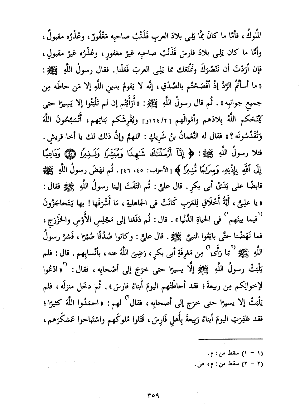 الْمُلُوكُ، فَأَمَّا مَا كَانَ مِمَّا يَلِي بِلَادَ الْعَرَبِ فَذَنْبُ صَاحِبِهِ مَغْفُورٌ، وَعُذْرُهُ مَقْبُولٌ، وَأَمَّا مَا كَانَ يَلِي بِلَادَ فَارِسَ فَذَنَبُ صَاحِبِهِ غَيْرُ مَغْفُورٍ، وَعُذْرُهُ غَيْرُ مَقْبُولٍ، فَإِنْ أَرَدْتَ أَنْ نَنْصُرَكَ وَنَمْنَعَكَ مِمَّا يَلِي الْعَرَبَ فَعَلْنَا. فَقَالَ رَسُولُ اللَّهِ صَلَّى اللَّهُ عَلَيْهِ وَسَلَّمَ: مَا أَسَأْتُمُ الرَّدَّ إِذْ أَفْصَحْتُمْ بِالصِّدْقِ، إِنَّهُ لَا يَقُومُ بِدِينِ اللَّهِ إِلَّا مَنْ حَاطَهُ مِنْ جَمِيعِ جَوَانِبِهِ. ثُمَّ قَالَ رَسُولُ اللَّهِ صَلَّى اللَّهُ عَلَيْهِ وَسَلَّمَ: " أَرَأَيْتُمْ إِنْ لَمْ تَلْبَثُوا إِلَّا يَسِيرًا حَتَّى يَمْنَحَكُمُ اللَّهُ بِلَادَهُمْ وَأَمْوَالَهُمْ، وَيُفْرِشَكُمْ بَنَاتِهِمْ، أَتُسَبِّحُونَ اللَّهَ وَتُقَدِّسُونَهُ؟ " فَقَالَ لَهُ النُّعْمَانُ بْنُ شَرِيكٍ: اللَّهُمَّ وَإِنَّ ذَلِكَ لَكَ يَا أَخَا قُرَيْشٍ. فَتَلَا رَسُولُ اللَّهِ صَلَّى اللَّهُ عَلَيْهِ وَسَلَّمَ {إِنَّا أَرْسَلْنَاكَ شَاهِدًا وَمُبَشِّرًا وَنَذِيرًا وَدَاعِيًا إِلَى اللَّهِ بِإِذْنِهِ وَسِرَاجًا مُنِيرًا} [الأحزاب: 45]