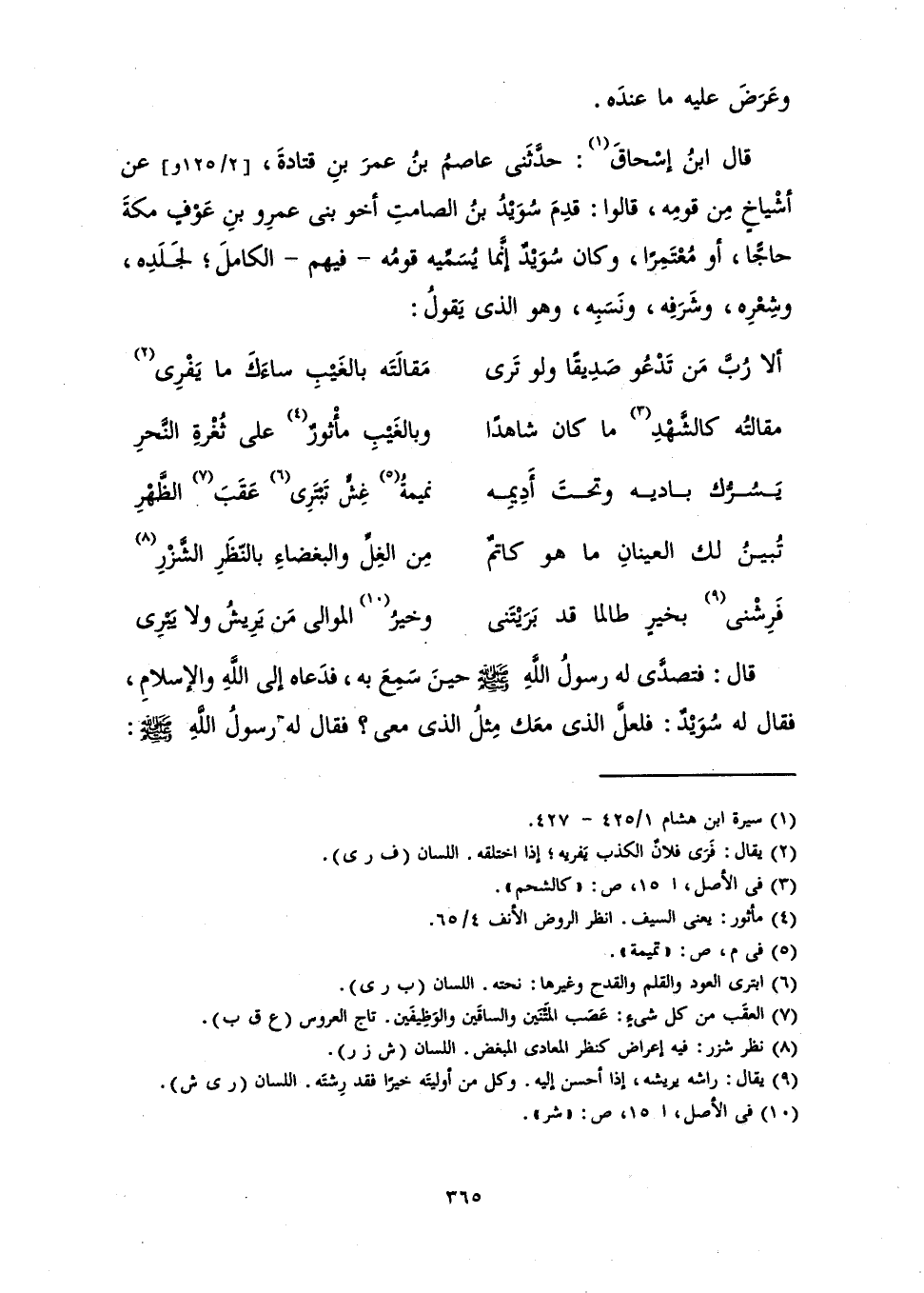 قَالَ: «فَتَصَدَّى لَهُ رَسُولُ اللَّهِ صَلَّى اللَّهُ عَلَيْهِ وَسَلَّمَ حِينَ سَمِعَ بِهِ. فَدَعَاهُ إِلَى اللَّهِ وَالْإِسْلَامِ، فَقَالَ لَهُ سُوَيْدٌ: فَلَعَلَّ الَّذِي مَعَكَ مِثْلُ الَّذِي مَعِي. فَقَالَ لَهُ رَسُولُ اللَّهِ صَلَّى اللَّهُ عَلَيْهِ وَسَلَّمَ: