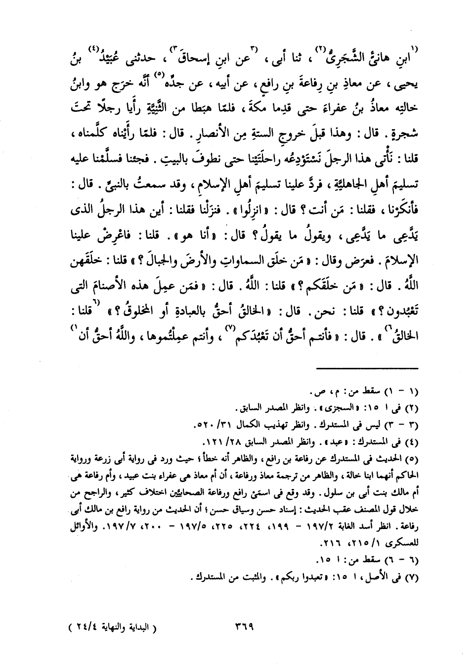 بْنِ هَانِئٍ الشَّجَرِيُّ، ثَنَا أَبِي، عَنِ ابْنِ إِسْحَاقَ، حَدَّثَنِي عُبَيْدُ بْنُ يَحْيَى، عَنْ مُعَاذِ بْنِ رِفَاعَةِ بْنِ رَافِعٍ، عَنْ أَبِيهِ، عَنْ جَدِّهِ، «أَنَّهُ خَرَجَ هُوَ وَابْنُ خَالَتِهِ مُعَاذُ ابْنُ عَفْرَاءَ، حَتَّى قَدِمَا مَكَّةَ، فَلَمَّا هَبَطَا مِنَ الثَّنِيَّةِ، رَأَيَا رَجُلًا تَحْتَ شَجَرَةٍ. قَالَ: وَهَذَا قَبْلَ خُرُوجِ السِّتَّةِ مِنَ الْأَنْصَارِ. قَالَ: فَلَمَّا رَأَيْنَاهُ كَلَّمْنَاهُ، قُلْنَا: نَأْتِي هَذَا الرَّجُلَ نَسْتَوْدِعُهُ رَاحِلَتَيْنَا حَتَّى نَطُوفَ بِالْبَيْتِ. فَجِئْنَا فَسَلَّمْنَا عَلَيْهِ تَسْلِيمَ أَهْلِ الْجَاهِلِيَّةِ، فَرَدَّ عَلَيْنَا تَسْلِيمَ أَهْلِ الْإِسْلَامِ، وَقَدْ سَمِعْتُ بِالنَّبِيِّ. قَالَ: فَأَنْكَرْنَا. فَقُلْنَا: مَنْ أَنْتَ؟ قَالَ: " انْزِلُوا ". فَنَزَلُوا فَقُلْنَا: أَيْنَ هَذَا الرَّجُلُ الَّذِي يَدَّعِي مَا يَدَّعِي، وَيَقُولُ مَا يَقُولُ؟ قَالَ: " أَنَا هُوَ ". قُلْنَا: فَاعْرِضْ عَلَيْنَا الْإِسْلَامَ. فَعَرَضَ، وَقَالَ: " مَنْ خَلَقَ السَّمَاوَاتِ وَالْأَرْضَ وَالْجِبَالَ؟ " قُلْنَا: خَلَقَهُنَّ اللَّهُ. قَالَ: " مَنْ خَلَقَكُمْ؟ " قُلْنَا: اللَّهُ. قَالَ: " فَمِنْ عَمَلِ هَذِهِ الْأَصْنَامَ التِي تَعْبُدُونَ؟ " قُلْنَا: نَحْنُ. قَالَ: " الْخَالِقُ أَحَقُّ بِالْعِبَادَةِ أَوِ الْمَخْلُوقُ؟ " قُلْنَا: الْخَالِقُ. قَالَ: " فَأَنْتُمْ أَحَقُّ أَنَّ تَعْبُدَكُمْ، وَأَنْتُمْ عَمِلْتُمُوهَا، وَاللَّهُ أَحَقُّ أَنْ