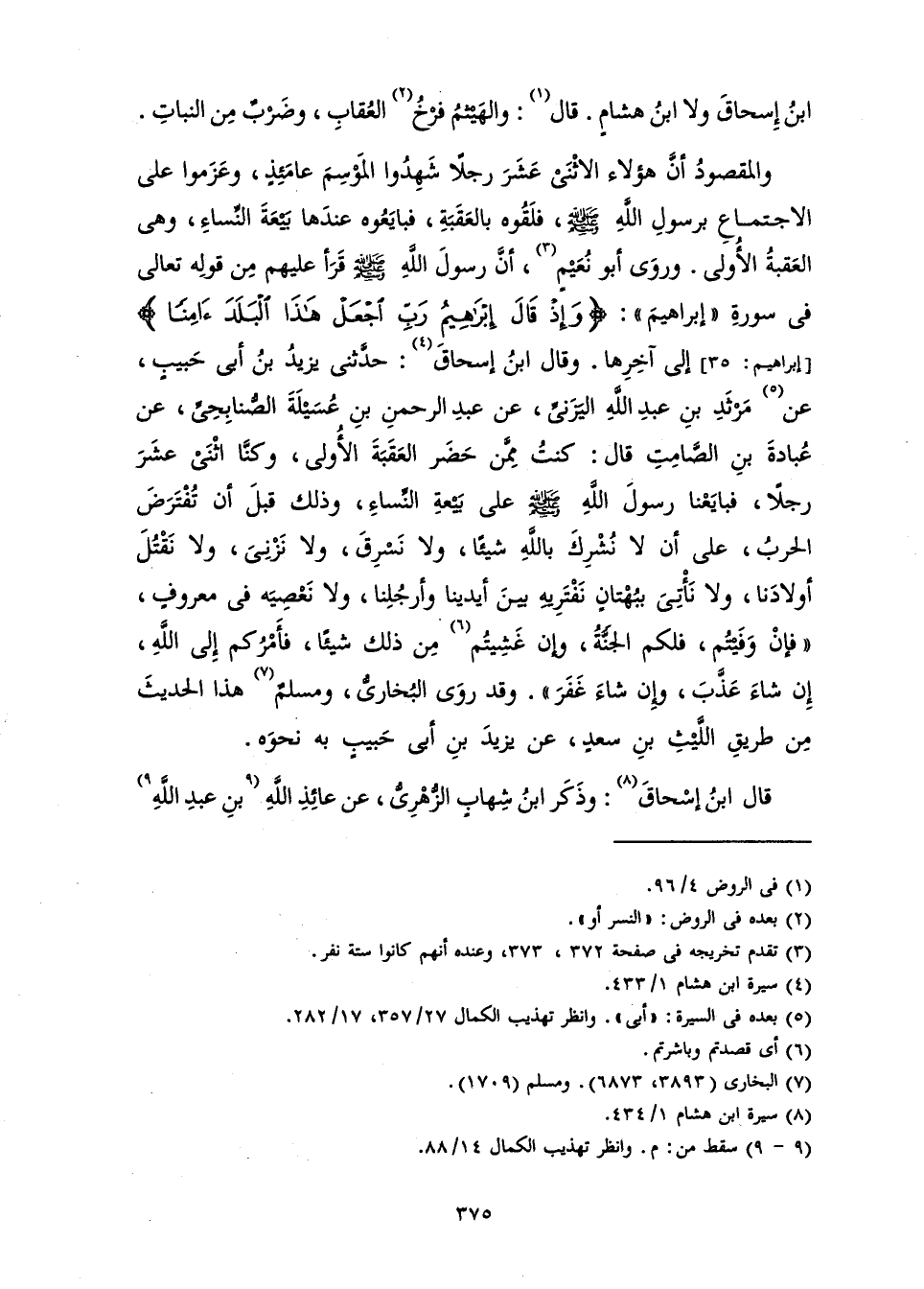 وَقَالَ ابْنُ إِسْحَاقَ: حَدَّثَنِي يَزِيدُ بْنُ أَبِي حَبِيبٍ، عَنْ مَرْثَدِ بْنِ عَبْدِ اللَّهِ الْيَزَنِيِّ، عَنْ عَبْدِ الرَّحْمَنِ بْنِ عُسَيْلَةَ الصُّنَابِحِيِّ، عَنْ عُبَادَةَ بْنِ الصَّامِتِ، قَالَ «كُنْتُ مِمَّنْ حَضَرَ الْعَقَبَةَ الْأُولَى، وَكُنَّا اثْنَيْ عَشَرَ رَجُلًا، فَبَايَعْنَا رَسُولَ اللَّهِ صَلَّى اللَّهُ عَلَيْهِ وَسَلَّمَ عَلَى بَيْعَةِ النِّسَاءِ وَذَلِكَ قَبْلَ أَنْ تُفْتَرَضَ الْحَرْبُ عَلَى أَنْ لَا نُشْرِكَ بِاللَّهِ شَيْئًا، وَلَا نَسْرِقَ، وَلَا نَزْنِيَ، وَلَا نَقْتُلَ أَوْلَادَنَا، وَلَا نَأْتِيَ بِبُهْتَانٍ نَفْتَرِيهِ بَيْنَ أَيْدِينَا وَأَرْجُلِنَا، وَلَا نَعْصِيَهُ فِي مَعْرُوفٍ، " فَإِنْ وَفَّيْتُمْ فَلَكُمُ الْجَنَّةُ وَإِنْ غَشِيتُمْ مِنْ ذَلِكَ شَيْئًا فَأَمْرُكُمْ إِلَى اللَّهِ إِنْ شَاءَ عَذَّبَ وَإِنْ شَاءَ غَفَرَ» ". وَقَدْ رَوَى الْبُخَارِيُّ وَمُسْلِمٌ هَذَا الْحَدِيثَ مِنْ طَرِيقِ اللَّيْثِ بْنِ سَعْدٍ، عَنْ يَزِيدَ بْنِ أَبِي حَبِيبٍ بِهِ نَحْوَهُ.
