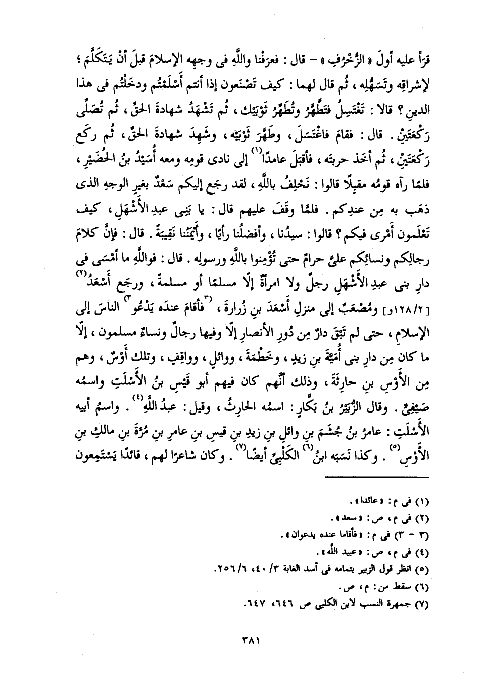 قَرَأَ عَلَيْهِ أَوَّلَ الزُّخْرُفِ، قَالَ: فَعَرَفْنَا وَاللَّهِ فِي وَجْهِهِ الْإِسْلَامَ قَبْلَ أَنْ يَتَكَلَّمَ لِإِشْرَاقِهِ وَتَسَهُّلِهِ، ثُمَّ قَالَ لَهُمَا: كَيْفَ تَصْنَعُونَ إِذَا أَنْتُمْ أَسْلَمْتُمْ وَدَخَلْتُمْ فِي هَذَا الدِّينِ؟ قَالَا: تَغْتَسِلُ فَتَطَّهَّرُ، وَتُطَهِّرُ ثَوْبَيْكَ، ثُمَّ تَشْهَدُ شَهَادَةَ الْحَقِّ، ثُمَّ تُصَلِّي رَكْعَتَيْنِ. قَالَ: فَقَامَ فَاغْتَسَلَ، وَطَهَّرَ ثَوْبَيْهِ، وَشَهِدَ شَهَادَةَ الْحَقِّ، ثُمَّ رَكَعَ رَكْعَتَيْنِ ثُمَّ أَخَذَ حَرْبَتَهُ، فَأَقْبَلَ عَامِدًا إِلَى نَادِي قَوْمِهِ وَمَعَهُ أُسَيْدُ بْنُ الْحُضَيْرِ، فَلَمَّا رَآهُ قَوْمُهُ مُقْبِلًا، قَالُوا: نَحْلِفُ بِاللَّهِ لَقَدْ رَجَعَ إِلَيْكُمْ سَعْدٌ بِغَيْرِ الْوَجْهِ الَّذِي ذَهَبَ بِهِ مِنْ عِنْدِكُمْ. فَلَمَّا وَقَفَ عَلَيْهِمْ، قَالَ: يَا بَنِي عَبْدِ الْأَشْهَلِ، كَيْفَ تَعْلَمُونَ أَمْرِي فِيكُمْ؟ قَالُوا: سَيِّدُنَا، وَأَفْضَلُنَا رَأْيًا، وَأَيْمَنُنَا نَقِيبَةً. قَالَ: فَإِنَّ كَلَامَ رِجَالِكُمْ وَنِسَائِكُمْ عَلَيَّ حَرَامٌ حَتَّى تُؤْمِنُوا بِاللَّهِ وَرَسُولِهِ. قَالَ: فَوَاللَّهِ مَا أَمْسَى فِي دَارِ بَنِي عَبْدِ الْأَشْهَلِ رَجُلٌ وَلَا امْرَأَةٌ إِلَّا مُسْلِمًا أَوْ مُسْلِمَةً، وَرَجَعَ أَسْعَدُ وَمُصْعَبٌ إِلَى مَنْزِلِ أَسْعَدَ بْنِ زُرَارَةَ، فَأَقَامَ عِنْدَهُ يَدْعُوَانِ النَّاسَ إِلَى الْإِسْلَامِ، حَتَّى لَمْ تَبْقَ دَارٌ مِنْ دَوْرِ الْأَنْصَارِ إِلَّا وَفِيهَا رِجَالٌ وَنِسَاءٌ مُسْلِمُونَ، إِلَّا مَا كَانَ مِنْ دَارِ بَنِي أُمَيَّةَ بْنِ زَيْدٍ وَخَطْمَةَ، وَوَائِلٍ، وَوَاقِفٍ، وَتِلْكَ أَوْسٌ، وَهُمْ مِنَ الْأَوْسِ بْنِ حَارِثَةَ، وَذَلِكَ أَنَّهُمْ كَانَ فِيهِمْ أَبُو قَيْسِ بْنُ الْأَسْلَتِ، وَاسْمُهُ صَيْفِيٌّ. وَقَالَ الزُّبَيْرُ بْنُ بَكَّارٍ اسْمُهُ الْحَارِثُ، وَقِيلَ: عَبْدُ اللَّهِ. وَاسْمُ أَبِيهِ الْأَسْلَتِ: عَامِرُ بْنُ جُشَمَ بْنِ وَائِلِ بْنِ زَيْدِ بْنِ قَيْسِ بْنِ عَامِرِ بْنِ مُرَّةَ بْنِ مَالِكِ بْنِ الْأَوْسِ، وَكَذَا نَسَبَهُ ابْنُ الْكَلْبِيِّ أَيْضًا. وَكَانَ شَاعِرًا لَهُمْ قَائِدًا، يَسْتَمِعُونَ