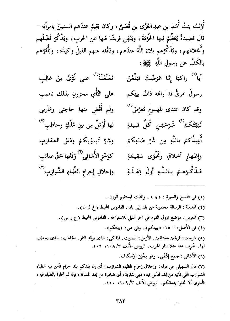 أَرْنَبُ بِنْتُ أَسَدِ بْنِ عَبْدِ الْعُزَّى بْنِ قُصَيٍّ، وَكَانَ يُقِيمُ عِنْدَهُمُ السِّنِينَ بِامْرَأَتِهِ - قَالَ قَصِيدَةً يُعَظِّمُ فِيهَا الْحُرْمَةَ، وَيَنْهَى قُرَيْشًا فِيهَا عَنِ الْحَرْبِ، وَيَذْكُرُ فَضْلَهُمْ وَأَحْلَامَهُمْ وَيُذَكِّرُهُمْ بَلَاءَ اللَّهِ عِنْدَهُمْ، وَدَفْعَهُ عَنْهُمُ الْفِيلَ وَكَيْدَهُ، وَيَأْمُرُهُمْ بِالْكَفِّ عَنْ رَسُولِ اللَّهِ صَلَّى اللَّهُ عَلَيْهِ وَسَلَّمَ: