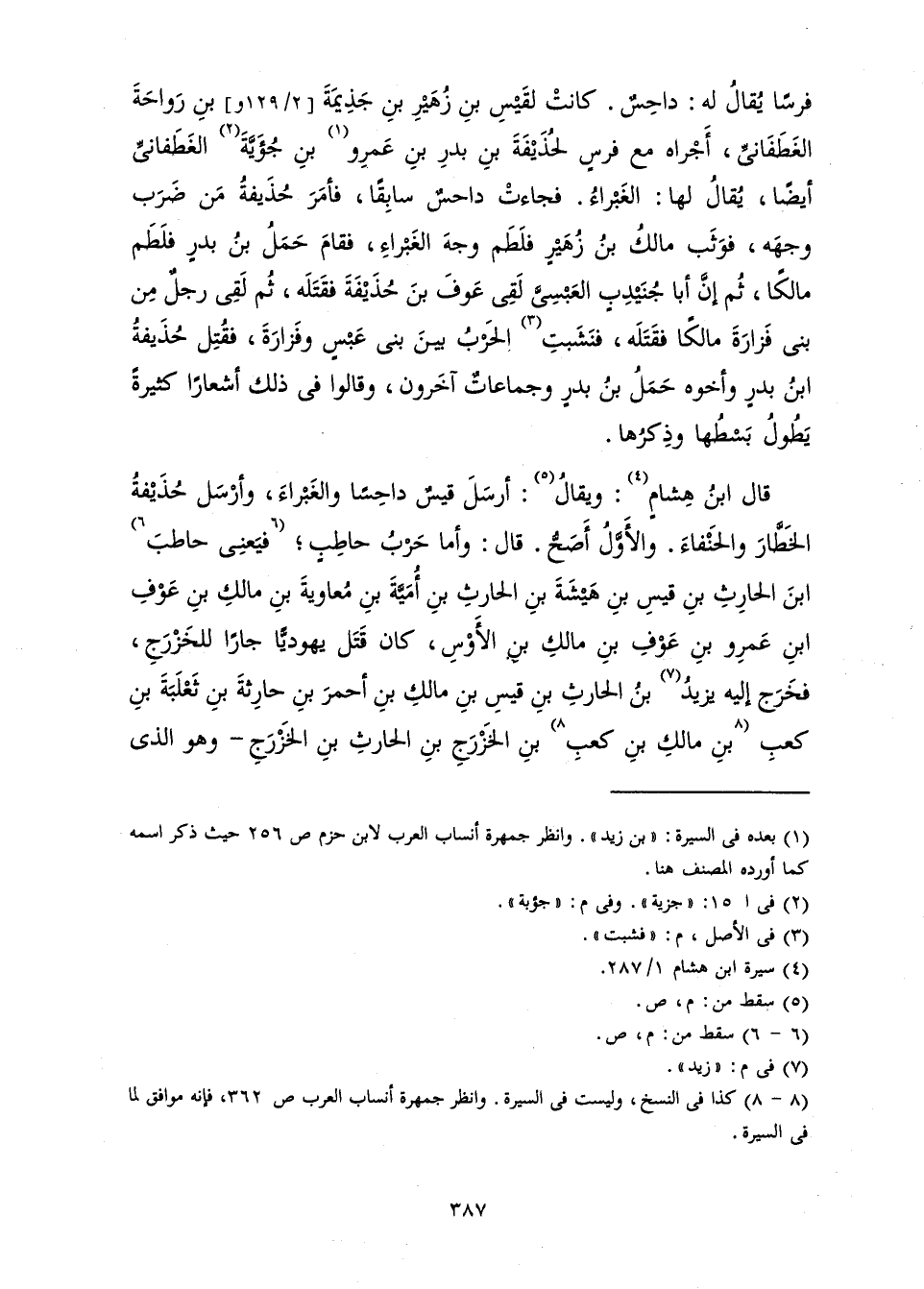 قَالَ ابْنُ هِشَامٍ وَيُقَالُ: أَرْسَلَ قَيْسٌ دَاحِسَ وَالْغَبْرَاءَ، وَأَرْسَلَ حُذَيْفَةُ الْخَطَّارَ وَالْحَنْفَاءَ. وَالْأَوَّلُ أَصَحُّ. قَالَ: وَأَمَّا حَرْبُ حَاطِبٍ; فَيَعْنِي حَاطِبَ بْنَ الْحَارِثِ بْنِ قَيْسِ بْنِ هَيْشَةَ بْنِ الْحَارِثِ بْنِ أُمَيَّةَ بْنِ مُعَاوِيَةَ بْنِ مَالِكِ بْنِ عَوْفِ بْنِ عَمْرِو بْنِ عَوْفِ بْنِ مَالِكِ بْنِ الْأَوْسِ، كَانَ قَتَلَ يَهُودِيًّا جَارًا لِلْخَزْرَجِ، فَخَرَجَ إِلَيْهِ يَزِيدُ بْنُ الْحَارِثِ بْنِ قَيْسِ بْنِ مَالِكِ بْنِ أَحْمَرَ بْنِ حَارِثَةَ بْنِ ثَعْلَبَةَ بْنِ كَعْبِ بْنِ مَالِكِ بْنِ كَعْبِ بْنِ الْخَزْرَجِ بْنِ الْحَارِثِ بْنِ الْخَزْرَجِ - وَهُوَ الَّذِي