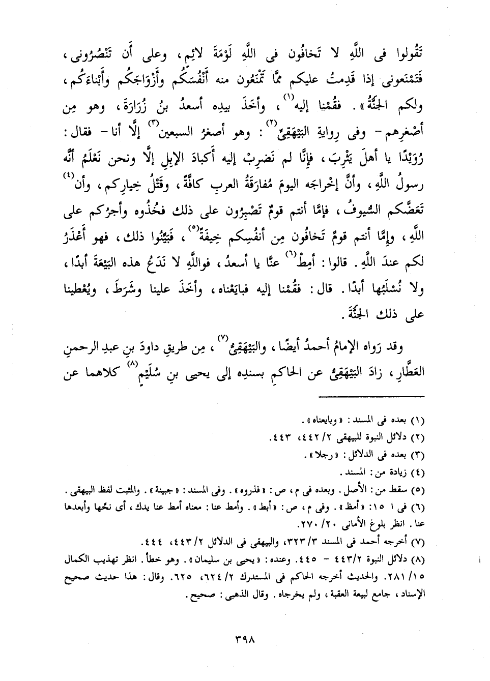 تَقُولُوا فِي اللَّهِ لَا تَخَافُونَ فِي اللَّهِ لَوْمَةَ لَائِمٍ، وَعَلَى أَنْ تَنْصُرُونِي فَتَمْنَعُونِي إِذَا قَدِمْتُ عَلَيْكُمْ مِمَّا تَمْنَعُونَ مِنْهُ أَنْفُسَكُمْ وَأَزْوَاجَكُمْ وَأَبْنَاءَكُمْ وَلَكُمُ الْجَنَّةُ ". فَقُمْنَا إِلَيْهِ، وَأَخَذَ بِيَدِهِ أَسْعَدُ بْنُ زُرَارَةَ، وَهُوَ مِنْ أَصْغَرِهِمْ - وَفِي رِوَايَةِ الْبَيْهَقِيِّ: وَهُوَ أَصْغَرُ السَّبْعِينَ إِلَّا أَنَا - فَقَالَ: رُوَيْدًا يَا أَهْلَ يَثْرِبَ، فَإِنَّا لَمْ نَضْرِبْ إِلَيْهِ أَكْبَادَ الْإِبِلِ إِلَّا وَنَحْنُ نَعْلَمُ أَنَّهُ رَسُولُ اللَّهِ، وَأَنَّ إِخْرَاجَهُ الْيَوْمَ مُفَارَقَةُ الْعَرَبِ كَافَّةً، وَقَتْلُ خِيَارِكُمْ، وَأَنْ تَعَضَّكُمُ السُّيُوفُ، فَإِمَّا أَنْتُمْ قَوْمٌ تَصْبِرُونَ عَلَى ذَلِكَ فَخُذُوهُ، وَأَجْرُكُمْ عَلَى اللَّهِ، وَإِمَّا أَنْتُمْ قَوْمٌ تَخَافُونَ مِنْ أَنْفُسِكُمْ خِيفَةً، فَبَيِّنُوا ذَلِكَ، فَهُوَ أَعْذُرُ لَكُمْ عِنْدَ اللَّهِ، قَالُوا: أَمِطْ عَنَّا يَا أَسْعَدُ، فَوَاللَّهِ لَا نَدَعُ هَذِهِ الْبَيْعَةَ أَبَدًا، وَلَا نُسْلَبُهَا أَبَدًا. قَالَ فَقُمْنَا إِلَيْهِ فَبَايَعْنَاهُ، وَأَخَذَ عَلَيْنَا وَشَرَطَ، وَيُعْطِينَا عَلَى ذَلِكَ الْجَنَّةَ»