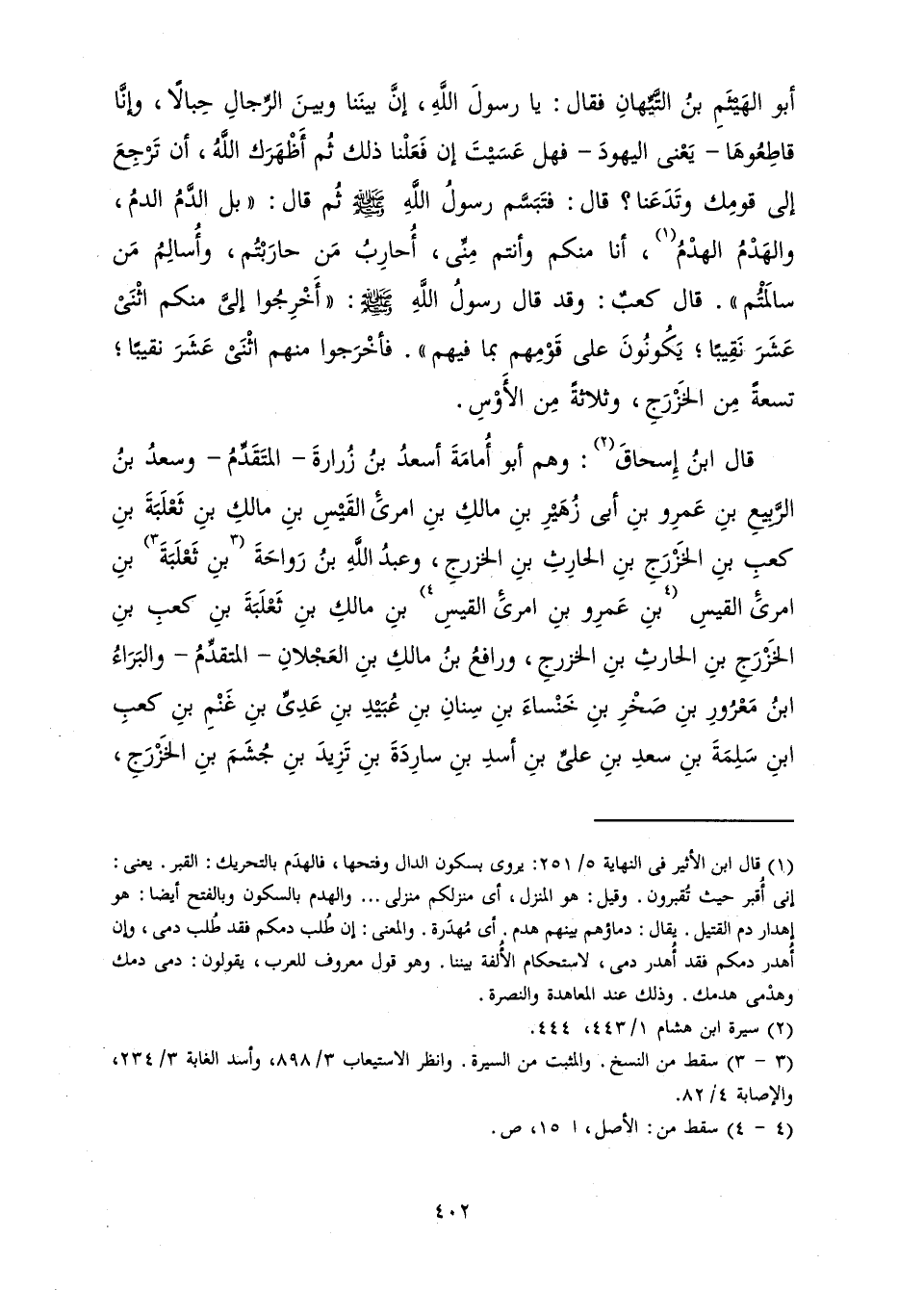 أَبُو الْهَيْثَمِ بْنُ التَّيِّهَانِ، فَقَالَ: يَا رَسُولَ اللَّهِ، إِنَّ بَيْنَنَا وَبَيْنَ الرِّجَالِ حِبَالًا، وَإِنَّا قَاطِعُوهَا - يَعْنِي الْيَهُودَ - فَهَلْ عَسَيْتَ إِنْ فَعَلْنَا ذَلِكَ ثُمَّ أَظْهَرَكَ اللَّهُ، أَنْ تَرْجِعَ إِلَى قَوْمِكَ وَتَدَعَنَا؟ قَالَ: فَتَبَسَّمَ رَسُولُ اللَّهِ صَلَّى اللَّهُ عَلَيْهِ وَسَلَّمَ، ثُمَّ قَالَ: " بَلِ الدَّمُ الدَّمُ، وَالْهَدْمُ الْهَدْمُ، أَنَا مِنْكُمْ وَأَنْتُمْ مِنِّي، أُحَارِبُ مَنْ حَارَبْتُمْ، وَأُسَالِمُ مَنْ سَالَمْتُمْ ". قَالَ كَعْبٌ: وَقَدْ قَالَ رَسُولُ اللَّهِ صَلَّى اللَّهُ عَلَيْهِ وَسَلَّمَ: " أَخْرِجُوا إِلَى مِنْكُمُ اثْنَيْ عَشَرَ نَقِيبًا يَكُونُونَ عَلَى قَوْمِهِمْ بِمَا فِيهِمْ " فَأَخْرَجُوا مِنْهُمُ اثْنَيْ عَشَرَ نَقِيبًا، تِسْعَةً مِنَ الْخَزْرَجِ، وَثَلَاثَةً مِنَ الْأَوْسِ.»