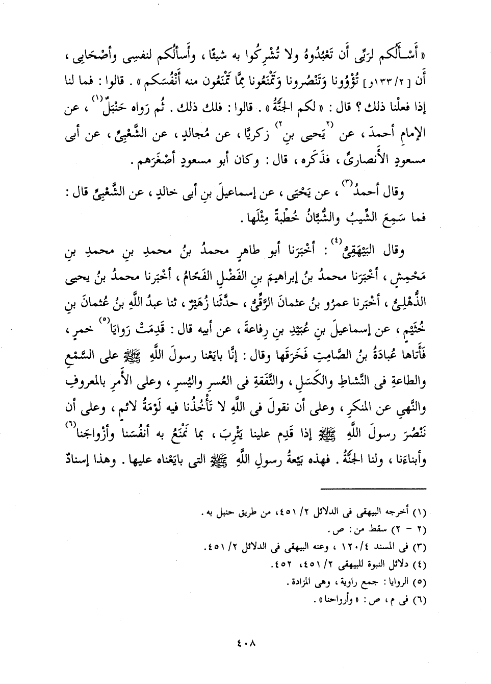 " أَسْأَلُكُمْ لِرَبِّي أَنْ تَعْبُدُوهُ وَلَا تُشْرِكُوا بِهِ شَيْئًا، وَأَسْأَلُكُمْ لِنَفْسِي وَأَصْحَابِي أَنْ تُؤْوُونَا وَتَنْصُرُونَا وَتَمْنَعُونَا مِمَّا تَمْنَعُونَ مِنْهُ أَنْفُسَكُمْ ". قَالُوا: فَمَا لَنَا إِذَا فَعَلْنَا ذَلِكَ؟ قَالَ: " لَكُمُ الْجَنَّةُ ". قَالُوا: فَلَكَ ذَلِكَ.» ثُمَّ رَوَاهُ حَنْبَلٌ، عَنِ الْإِمَامِ أَحْمَدَ، عَنْ يَحْيَى بْنِ زَكَرِيَّا، عَنْ مُجَالِدٍ، عَنِ الشَّعْبِيِّ، عَنْ أَبِي مَسْعُودٍ الْأَنْصَارِيِّ، فَذَكَرُهُ قَالَ: وَكَانَ أَبُو مَسْعُودٍ أَصْغَرَهُمْ.