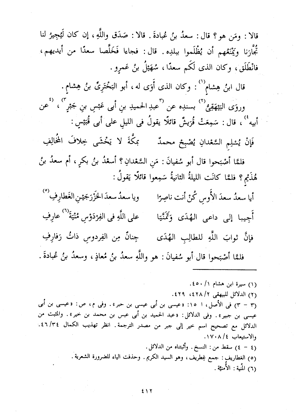 قَالَا: وَمَنْ هُوَ؟ قَالَ: سَعْدُ بْنُ عُبَادَةَ قَالَا: صَدَقَ وَاللَّهِ إِنْ كَانَ لَيُجِيرُ لَنَا تُجَّارَنَا وَيَمْنَعَهُمْ أَنْ يُظْلَمُوا بِبَلَدِهِ. قَالَ: فَجَاءَ فَخَلَّصَا سَعْدًا مِنْ أَيْدِيهِمْ، فَانْطَلَقَ وَكَانَ الَّذِي لَكَمَ سَعْدًا سُهَيْلُ بْنُ عَمْرٍو