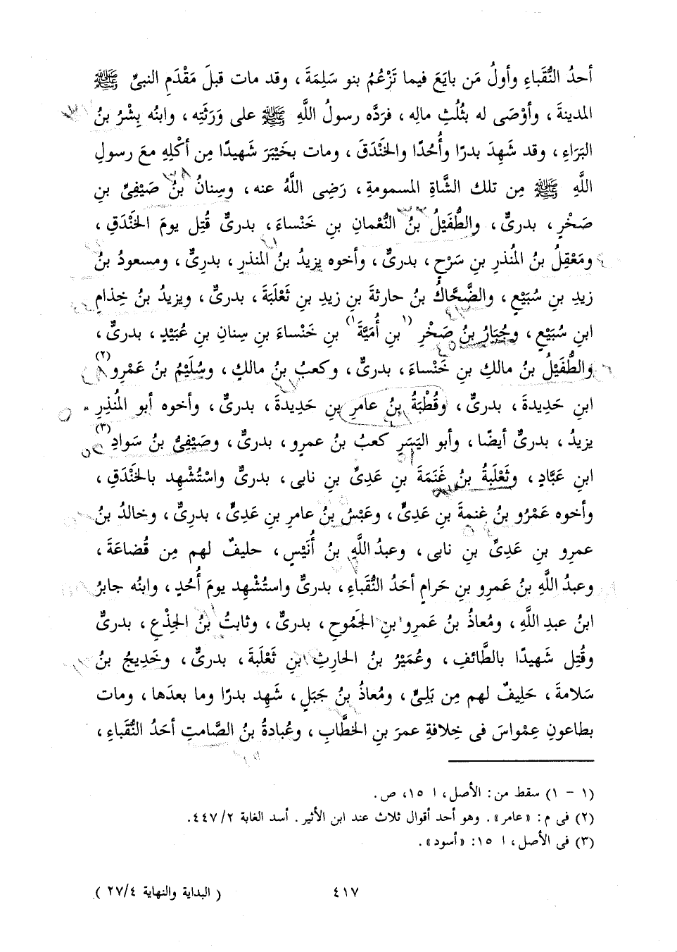 أَحَدُ النُّقَبَاءِ، وَأَوَّلُ مَنْ بَايَعَ فِيمَا تَزْعُمُ بَنُو سَلِمَةَ، وَقَدْ مَاتَ قَبْلَ مَقْدَمِ النَّبِيِّ صَلَّى اللَّهُ عَلَيْهِ وَسَلَّمَ الْمَدِينَةَ، وَأَوْصَى لَهُ بِثُلْثِ مَالِهِ، فَرَدَّهُ رَسُولُ اللَّهِ صَلَّى اللَّهُ عَلَيْهِ وَسَلَّمَ عَلَى وَرَثَتِهِ، وَابْنُهُ بِشْرُ بْنُ الْبَرَاءِ، وَقَدْ شَهِدَ بَدْرًا وَأُحُدًا وَالْخَنْدَقَ، وَمَاتَ بِخَيْبَرَ شَهِيدًا مِنْ أَكْلِهِ مَعَ رَسُولِ اللَّهِ صَلَّى اللَّهُ عَلَيْهِ وَسَلَّمَ مِنْ تِلْكَ الشَّاةِ الْمَسْمُومَةِ رَضِيَ اللَّهُ عَنْهُ، وَسِنَانُ بْنُ صَيْفِيِّ بْنِ صَخْرٍ، بَدْرِيٌّ، وَالطُّفَيْلُ بْنُ النُّعْمَانِ بْنِ خَنْسَاءَ، بَدْرِيٌّ، قُتِلَ يَوْمَ الْخَنْدَقِ، وَمَعْقِلُ بْنُ الْمُنْذِرِ بْنِ سَرْحٍ، بَدْرِيٌّ، وَأَخُوهُ يَزِيدُ بْنُ الْمُنْذِرِ، بَدْرِيٌّ، وَمَسْعُودُ بْنُ زَيْدِ بْنِ سُبَيْعٍ، وَالضَّحَّاكُ بْنُ حَارِثَةَ بْنِ زَيْدِ بْنِ ثَعْلَبَةَ، بَدْرِيٌّ، وَيَزِيدُ بْنُ خِذَامِ بْنِ سُبَيْعٍ، وَجُبَارُ بْنُ صَخْرِ بْنِ أُمَيَّةَ بْنِ خَنْسَاءَ بْنِ سِنَانَ بْنِ عُبَيْدٍ، بَدْرِيٌّ، وَالطُّفَيْلُ بْنُ مَالِكِ بْنِ خَنْسَاءَ، بَدْرِيٌّ، وَكَعْبُ بْنُ مَالِكٍ، وَسُلَيْمُ بْنُ عَمْرِو بْنِ حَدِيدَةَ، بَدْرِيٌّ، وَقُطْبَةُ بْنُ عَامِرِ بْنِ حَدِيدَةَ، بَدْرِيٌّ، وَأَخُوهُ أَبُو الْمُنْذِرِ يَزِيدُ، بَدْرِيٌّ أَيْضًا، وَأَبُو الْيَسَرِ كَعْبُ بْنُ عَمْرٍو، بَدْرِيٌّ، وَصَيْفِيُّ بْنُ سَوَادِ بْنِ عَبَّادٍ، وَثَعْلَبَةُ بْنُ غَنَمَةَ بْنِ عَدِيِّ بْنِ نَابِي، بَدْرِيٌّ وَاسْتُشْهِدَ بِالْخَنْدَقِ، وَأَخُوهُ عَمْرُو بْنُ غَنَمَةَ بْنِ عَدِيٍّ، وَعَبْسُ بْنُ عَامِرِ بْنِ عَدِيٍّ، بَدْرِيٌّ، وَخَالِدُ بْنُ عَمْرِو بْنِ عَدِيِّ بْنِ نَابِي، وَعَبْدُ اللَّهِ بْنُ أُنَيْسٍ، حَلِيفٌ لَهُمْ مِنْ قُضَاعَةَ، وَعَبْدُ اللَّهِ بْنُ عَمْرِو بْنِ حَرَامٍ أَحَدُ النُّقَبَاءِ، بَدْرِيٌّ، وَاسْتُشْهِدَ يَوْمَ أُحُدٍ، وَابْنُهُ جَابِرُ بْنُ عَبْدِ اللَّهِ، وَمُعَاذُ بْنُ عَمْرِو بْنِ الْجَمُوحِ، بَدْرِيٌّ، وَثَابِتُ بْنُ الْجِذْعِ، بَدْرِيٌّ وَقُتِلَ شَهِيدًا بِالطَّائِفِ، وَعُمَيْرُ بْنُ الْحَارِثِ بْنِ ثَعْلَبَةَ، بَدْرِيٌّ، وَخَدِيجُ بْنُ سَلَامَةَ، حَلِيفٌ لَهُمْ مِنْ بَلِيٍّ، وَمُعَاذُ بْنُ جَبَلٍ، شَهِدَ بَدْرًا وَمَا بَعْدَهَا، وَمَاتَ بِطَاعُونِ عِمْوَاسَ فِي خِلَافَةِ عُمَرَ بْنِ الْخَطَّابِ، وَعُبَادَةُ بْنُ الصَّامِتِ أَحَدُ النُّقَبَاءِ،