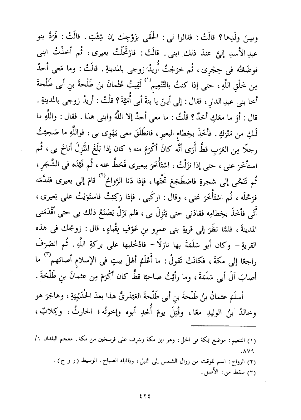 وَبَيْنَ وَلَدِهَا؟ قَالَتْ: فَقَالُوا لِي: الْحَقِي بِزَوْجِكِ إِنْ شِئْتِ. قَالَتْ: فَرَدَّ بَنُو عَبْدِ الْأَسَدِ إِلَيَّ عِنْدَ ذَلِكَ ابْنِي، قَالَتْ: فَارْتَحَلْتُ بَعِيرِي، ثُمَّ أَخَذْتُ ابْنِي فَوَضَعْتُهُ فِي حِجْرِي، ثُمَّ خَرَجْتُ أُرِيدُ زَوْجِي بِالْمَدِينَةِ، قَالَتْ: وَمَا مَعِي أَحَدٌ مِنْ خَلْقِ اللَّهِ، حَتَّى إِذَا كُنْتُ بِالتَّنْعِيمِ لَقِيتُ عُثْمَانَ بْنَ طَلْحَةَ بْنِ أَبِي طَلْحَةَ أَخَا بَنِي عَبْدِ الدَّارِ، فَقَالَ: إِلَى أَيْنَ يَا ابْنَةَ أَبِي أُمَيَّةَ؟ قُلْتُ: أُرِيدُ زَوْجِي بِالْمَدِينَةِ. قَالَ: أَوْ مَا مَعَكِ أَحَدٌ؟ قُلْتُ: مَا مَعِي أَحَدٌ إِلَّا اللَّهُ وَابْنِي هَذَا. فَقَالَ: وَاللَّهِ مَا لَكِ مِنْ مَتْرَكٍ. فَأَخَذَ بِخِطَامِ الْبَعِيرِ فَانْطَلَقَ مَعِي يَهْوِي بِي، فَوَاللَّهِ مَا صَحِبْتُ رَجُلًا مِنَ الْعَرَبِ قَطُّ أَرَى أَنَّهُ كَانَ أَكْرَمَ مِنْهُ; كَانَ إِذَا بَلَغَ الْمَنْزِلَ أَنَاخَ بِي، ثُمَّ اسْتَأْخَرَ عَنِّي، حَتَّى إِذَا نَزَلْتُ اسْتَأْخَرَ بِبَعِيرِي فَحَطَّ عَنْهُ، ثُمَّ قَيَّدَهُ فِي الشَّجَرِ، ثُمَّ تَنَحَّى إِلَى شَجَرَةٍ فَاضْطَجَعَ تَحْتَهَا، فَإِذَا دَنَا الرَّوَاحُ قَامَ إِلَى بَعِيرِي فَقَدَّمَهُ فَرَحَّلَهُ، ثُمَّ اسْتَأْخَرَ عَنِّي، وَقَالَ: ارْكَبِي. فَإِذَا رَكِبْتُ فَاسْتَوَيْتُ عَلَى بَعِيرِي، أَتَى فَأَخَذَ بِخِطَامِهِ فَقَادَنِي حَتَّى يَنْزِلَ بِي، فَلَمْ يَزَلْ يَصْنَعُ ذَلِكَ بِي حَتَّى أَقْدَمَنِي الْمَدِينَةَ، فَلَمَّا نَظَرَ إِلَى قَرْيَةِ بَنِي عَمْرِو بْنِ عَوْفٍ بِقُبَاءٍ، قَالَ: زَوْجُكِ فِي هَذِهِ الْقَرْيَةِ - وَكَانَ أَبُو سَلَمَةَ بِهَا نَازِلًا - فَادْخُلِيهَا عَلَى بَرَكَةِ اللَّهِ. ثُمَّ انْصَرَفَ رَاجِعًا إِلَى مَكَّةَ فَكَانَتْ تَقُولُ: مَا أَعْلَمُ أَهْلَ بَيْتٍ فِي الْإِسْلَامِ أَصَابَهُمْ مَا أَصَابَ آلَ أَبِي سَلَمَةَ، وَمَا رَأَيْتُ صَاحِبًا قَطُّ كَانَ أَكْرَمَ مِنْ عُثْمَانَ بْنِ طَلْحَةَ.