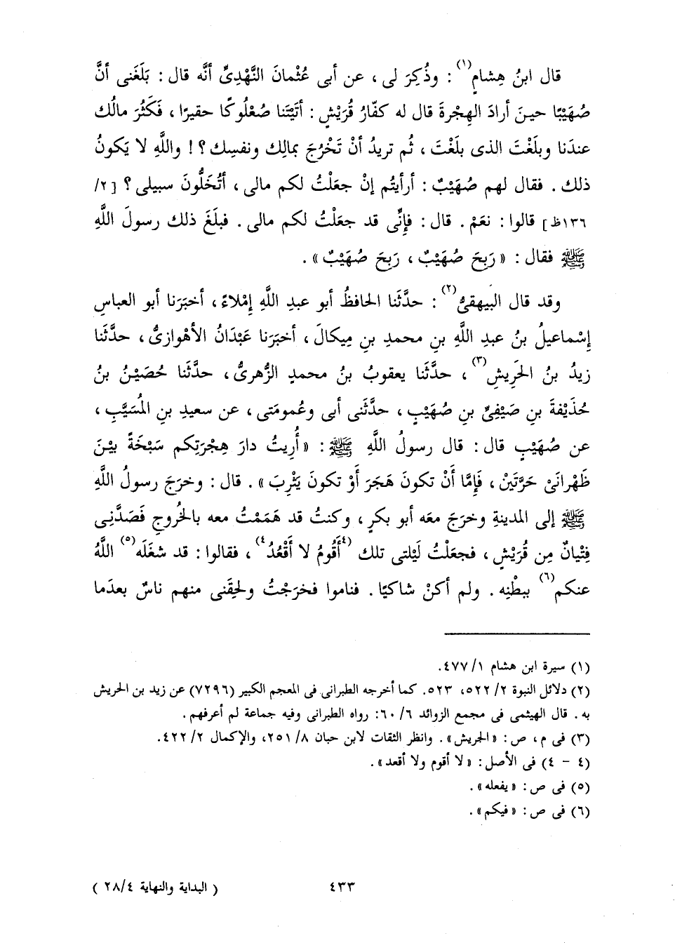 قَالَ ابْنُ هِشَامٍ: وَذُكِرَ لِي عَنْ أَبِي عُثْمَانَ النَّهْدِيِّ، أَنَّهُ قَالَ: «بَلَغَنِي أَنَّ صُهَيْبًا حِينَ أَرَادَ الْهِجْرَةَ، قَالَ لَهُ كُفَّارُ قُرَيْشٍ: أَتَيْتَنَا صُعْلُوكًا حَقِيرًا، فَكَثُرَ مَالُكَ عِنْدَنَا وَبَلَغْتَ الَّذِي بَلَغْتَ، ثُمَّ تُرِيدُ أَنْ تَخْرُجَ بِمَالِكِ وَنَفْسِكَ؟ وَاللَّهِ لَا يَكُونُ ذَلِكَ. فَقَالَ لَهُمْ صُهَيْبٌ: أَرَأَيْتُمْ إِنْ جَعَلْتُ لَكُمْ مَالِي أَتُخَلُّونَ سَبِيلِي؟ قَالُوا: نَعَمْ. قَالَ: فَإِنِّي قَدْ جَعَلْتُ لَكُمْ مَالِي. فَبَلَغَ ذَلِكَ رَسُولَ اللَّهِ صَلَّى اللَّهُ عَلَيْهِ وَسَلَّمَ فَقَالَ: " رَبِحَ صُهَيْبٌ، رَبِحَ صُهَيْبٌ»